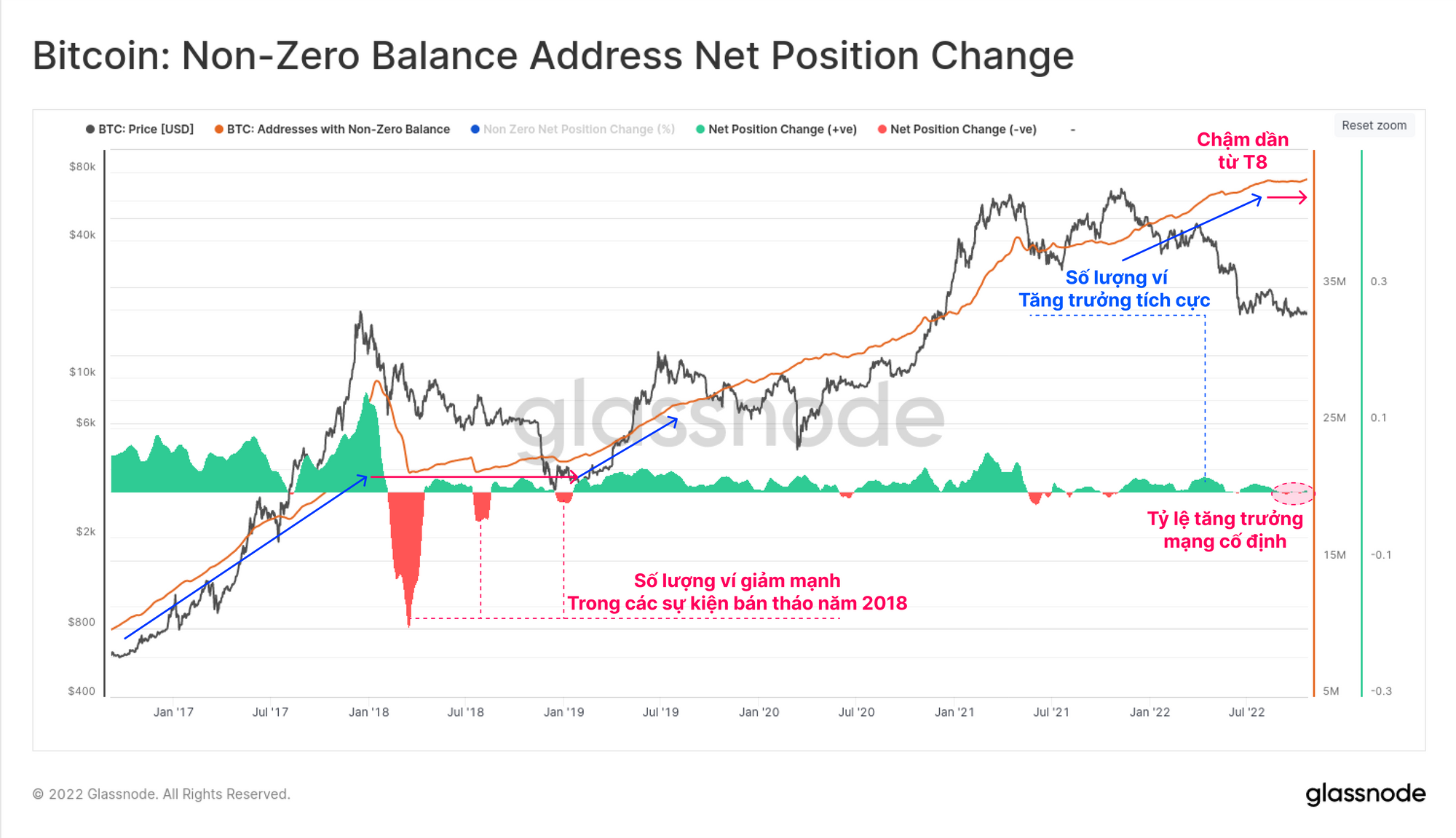 Tốc độ tăng trưởng của các ví có số dư lớn hơn 0 cũng bị đình trệ kể từ tháng 8, tương tự giai đoạn tháng 11 năm 2018. Điều này cho thấy rằng mặc dù có khoảng 400,000 địa chỉ mới mỗi ngày, nhưng rất nhiều trong số đó đang có số dư bằng 0.