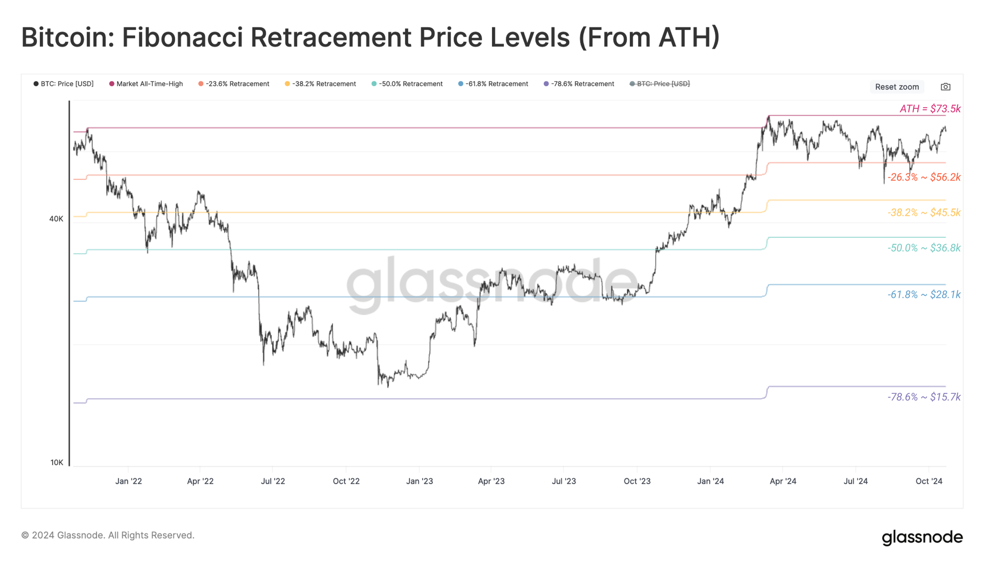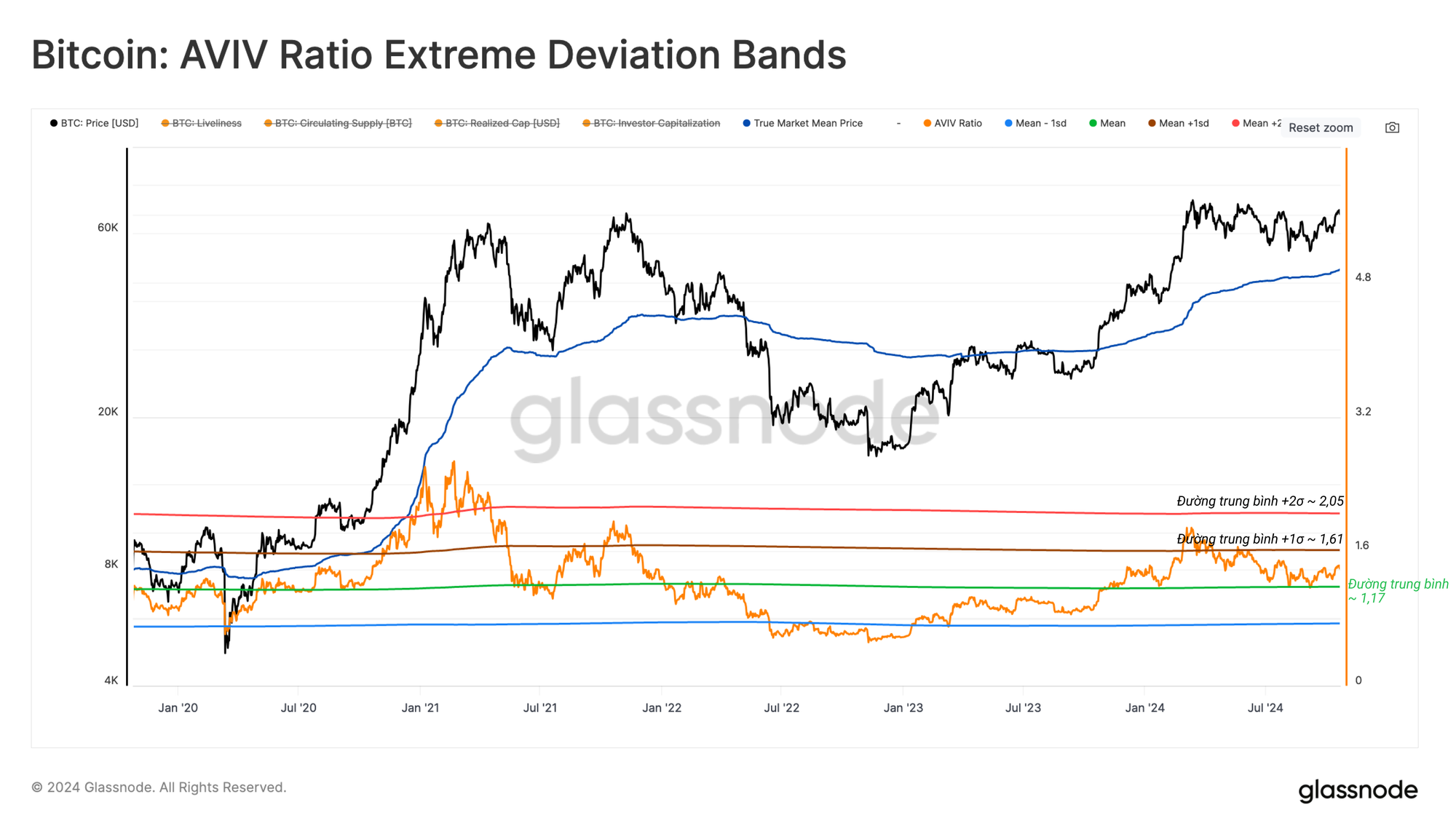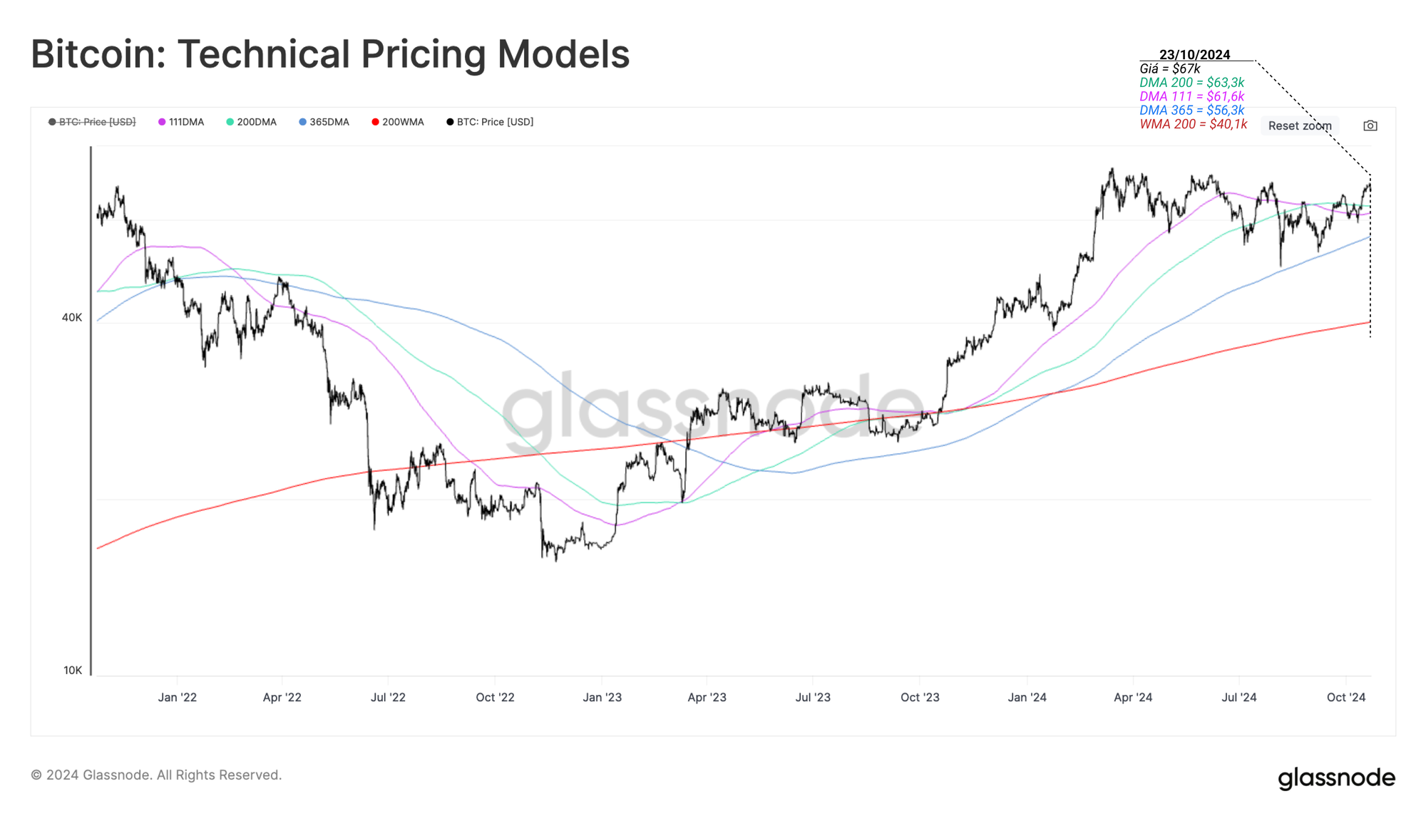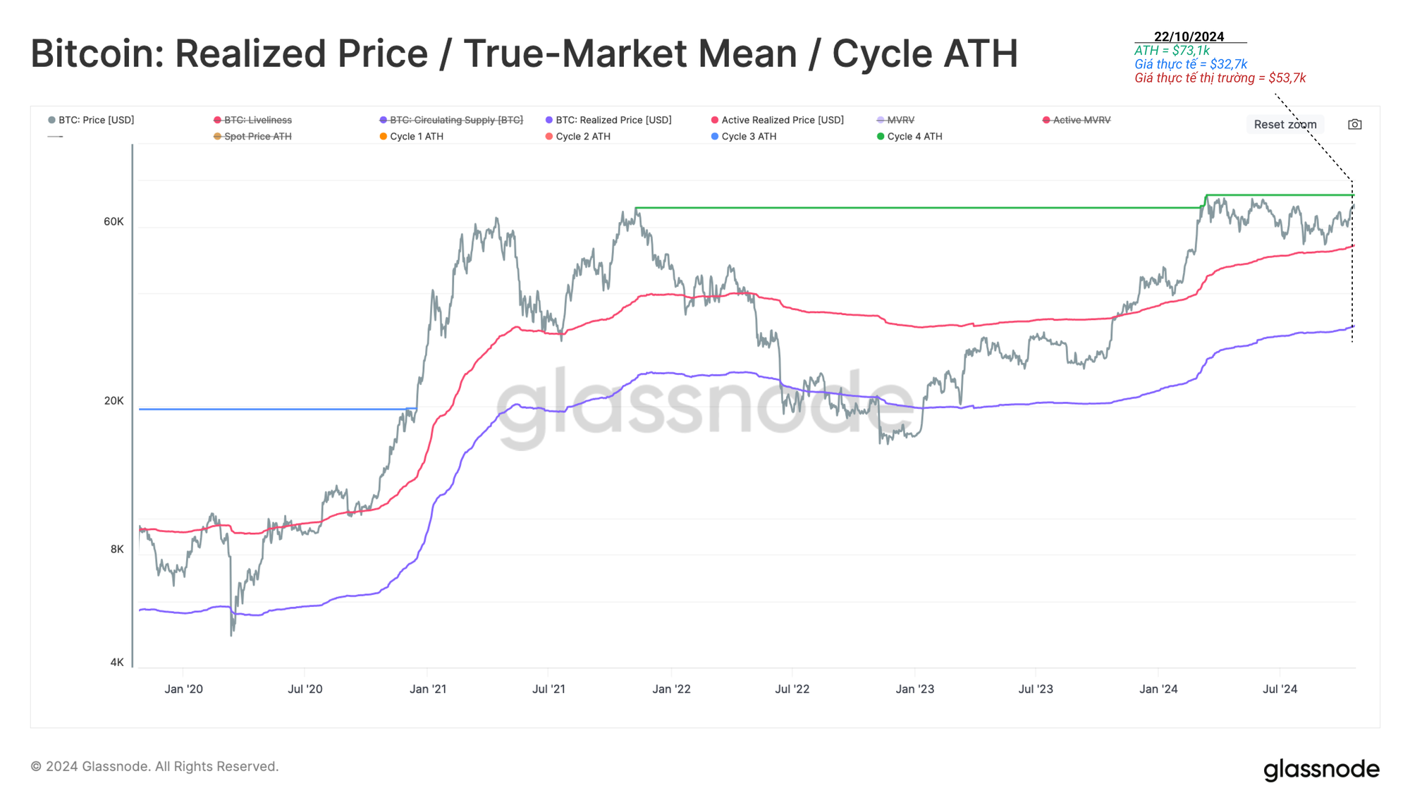 Giá đang nỗ lực chuyển từ chế độ Thị trường tăng giá nhiệt tình sang Thị trường tăng giá hưng phấn, thể hiện qua sự phá vỡ liên tục trên mức ATH năm 2021 là $69k. Mức này đã bị phá vỡ trong thời gian ngắn tại đỉnh tháng 3 năm 2024, tuy nhiên hoạt động chốt lời quá lớn vào thời điểm đó đã xảy ra, đòi hỏi phải có một khoảng thời gian để làm dịu sự phấn khích của nhà đầu tư.