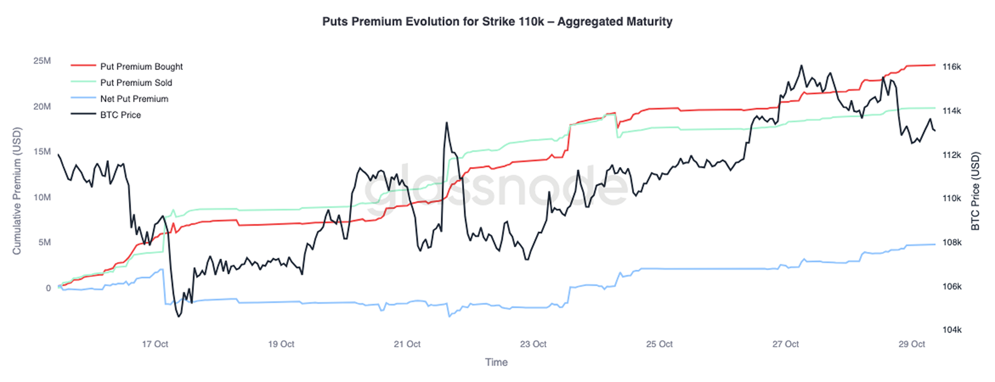 Để hoàn thiện bức tranh, chúng ta có thể chuyển sang xem xét phía quyền chọn bán của thị trường. Kể từ ngày 24 tháng 10, các nhà giao dịch đã mua quyền chọn bán ở mức $110K khi Bitcoin tăng giá cao hơn, báo hiệu nhu cầu phòng ngừa rủi ro giảm giá trong ngắn hạn. Trong khi đó, quyền chọn bán ở mức $105K đã được bán ra tích cực hơn, cho thấy những người tham gia thị trường thoải mái trong việc thu phí bằng cách cung cấp bảo hiểm ở các mức giá thực hiện sâu hơn.
