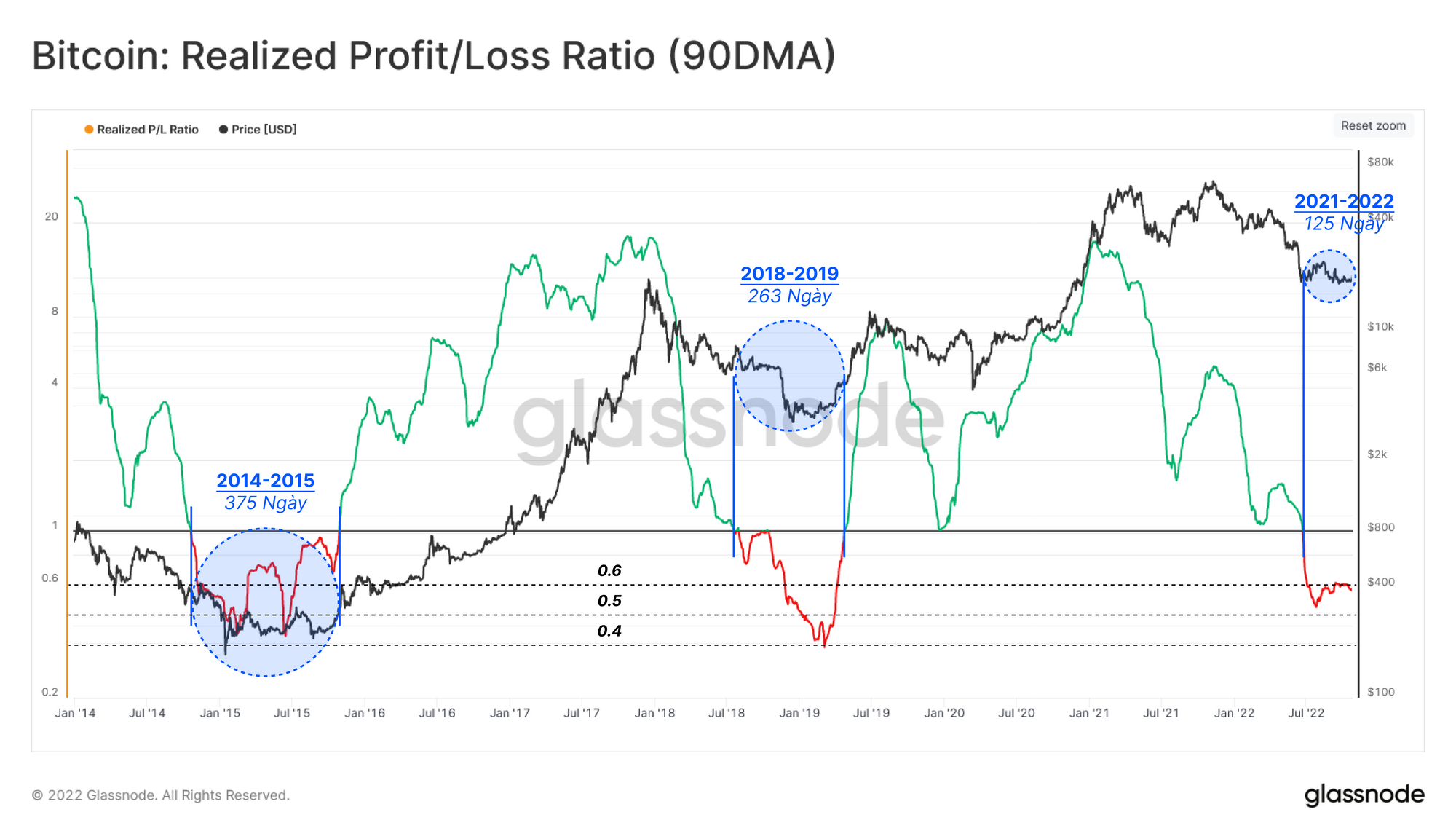 Để đạt được mục tiêu này, chúng tôi sử dụng chỉ báo Realized Profit/Loss Ratio đo tỷ lệ giữa khối lượng BTC di chuyển có lợi nhuận với BTC được chuyển nhượng với giá thua lỗ. Theo dõi mức trung bình hàng quý của chỉ báo này cho phép các nhà phân tích đánh giá mức độ thống trị vĩ mô của lượng BTC có lời đang di chuyển.