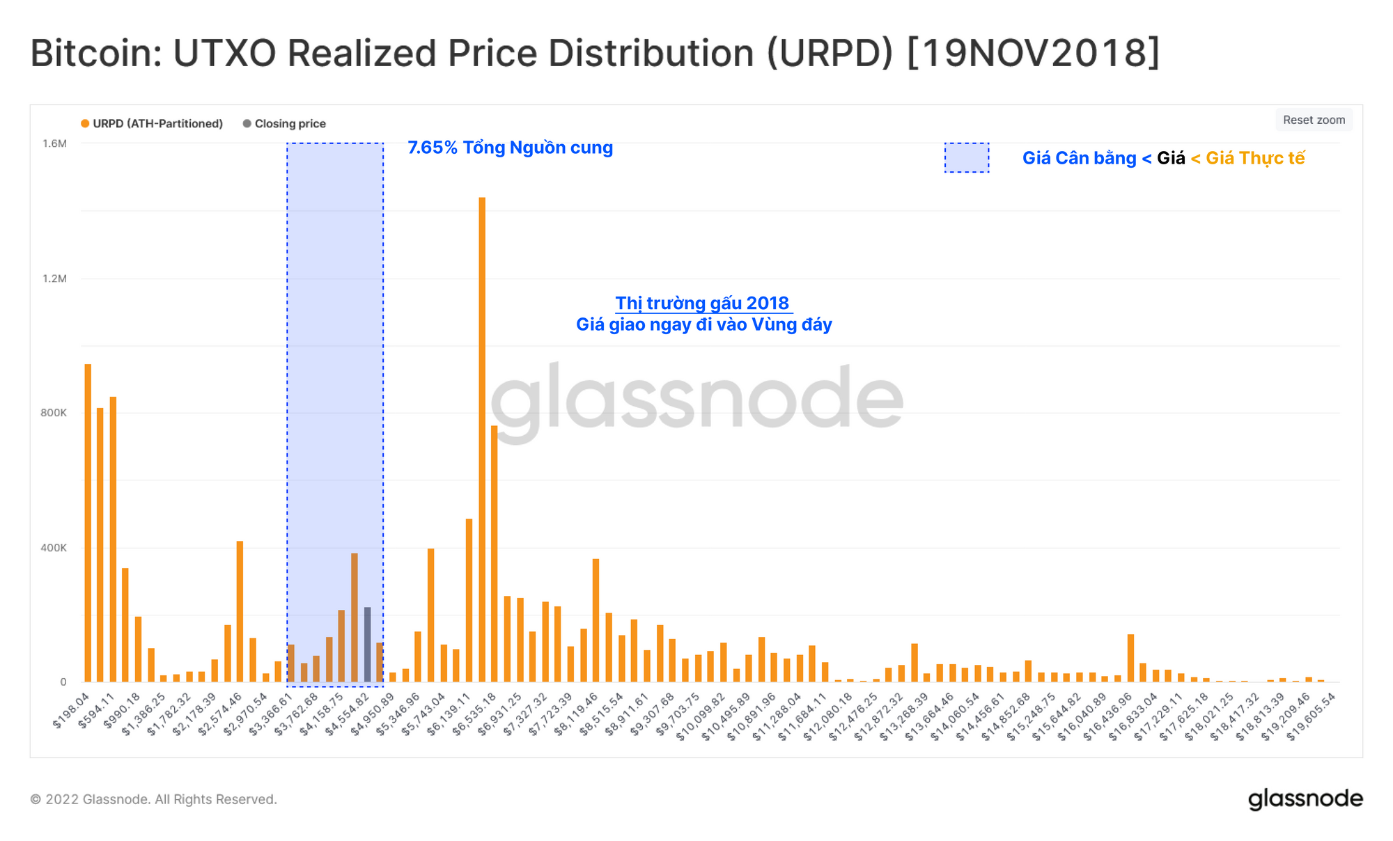 Trong giai đoạn Dò đáy 2018-2019, khoảng 22.7% tổng nguồn cung (30.36% - 7.65%) được phân phối lại khi giá giao ngay được giao dịch trong phạm vi nói trên.