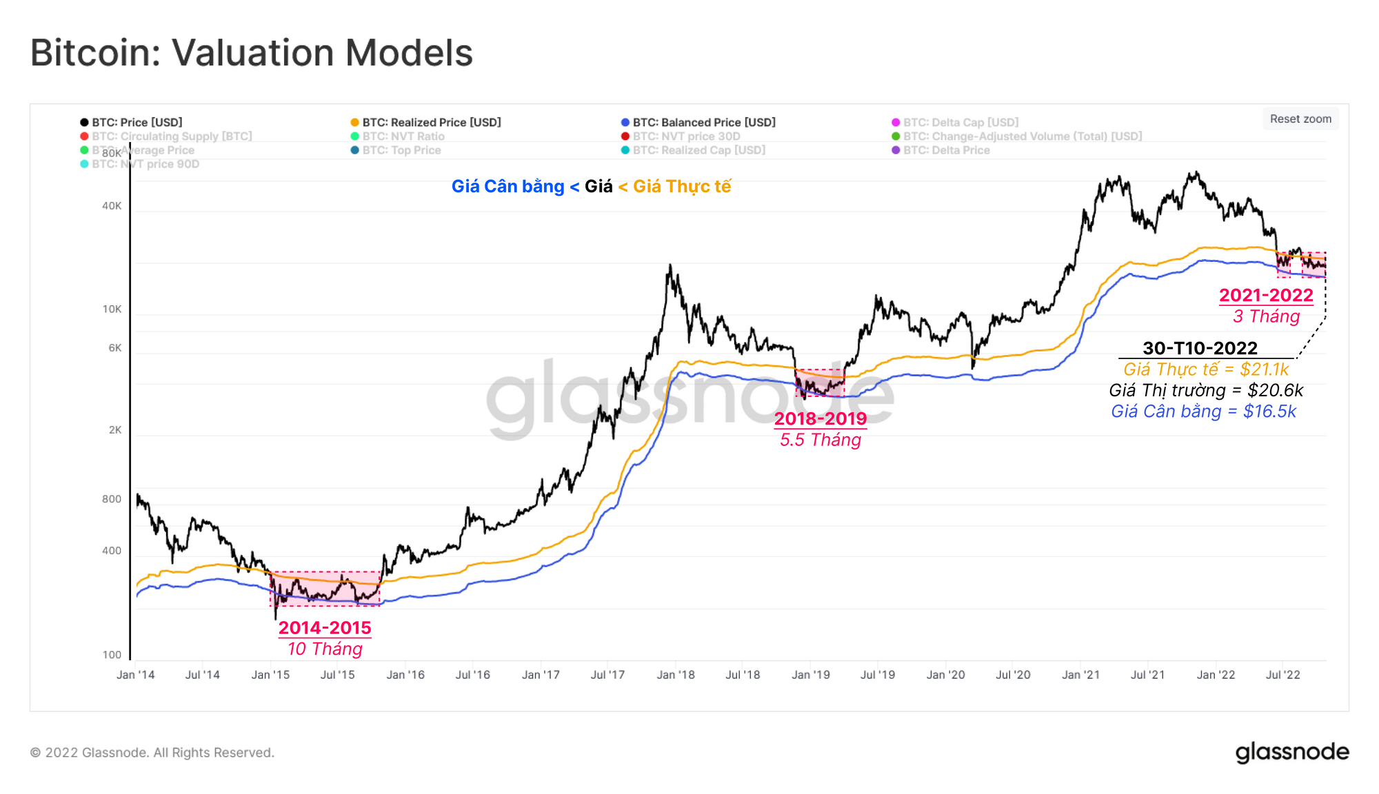 Hai ứng cử viên lý tưởng để ước lượng vùng giá đáy là Realized Price (Dải trên ~ $ 21,100) 🟠 đã đề cập ở trên và Balanced Price (Dải dưới ~ $16,500) 🔵. Giá cân bằng thể hiện sự khác biệt giữa Realized Price và Transferred Price. Một dạng của mô hình “Fair Value” ghi lại sự khác biệt giữa những coin đã được mua (giá gốc) và những coin đã được chi tiêu (được chuyển giao).
