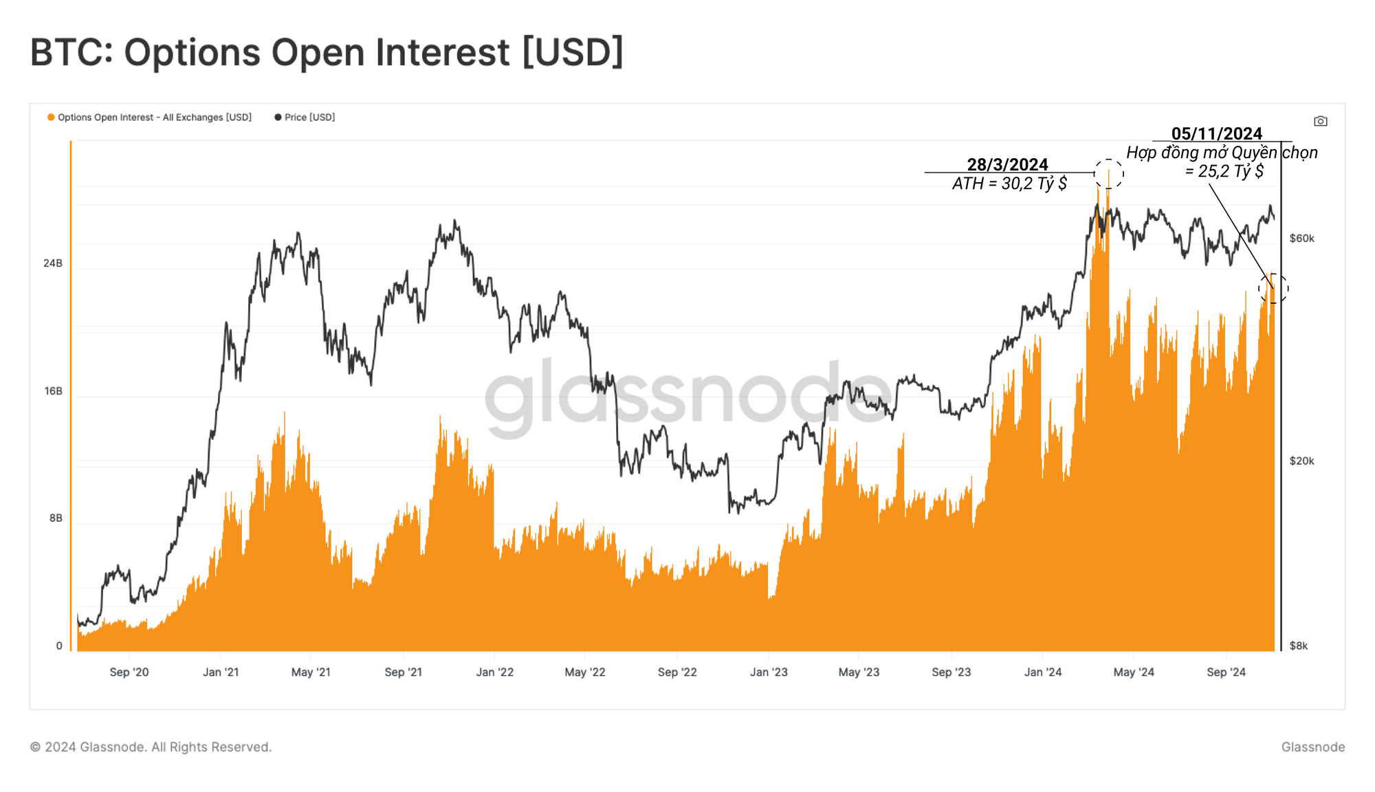 Số lượng hợp đồng mở được triển khai trên các hợp đồng quyền chọn đã tăng vọt lên giá trị 25,2 tỷ USD, chỉ có ATH vào tháng 3 ghi nhận giá trị cao hơn là 30,2 tỷ USD.
