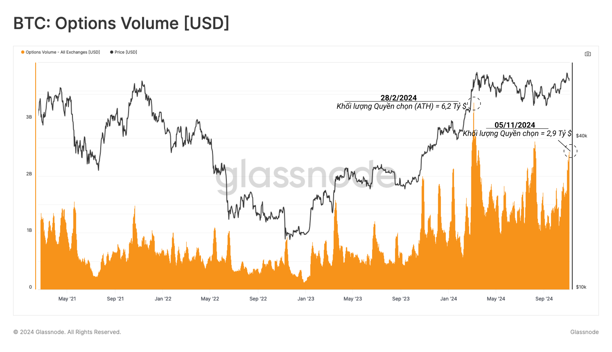 Khối lượng giao dịch quyền chọn cũng đang tăng cao hơn, hiện đạt giá trị 2,9 tỷ USD, chỉ thấp hơn khối lượng giao dịch vào ATH tháng 3 và trong đợt thanh lý các giao dịch chênh lệch lãi suất đồng yên ngày 5 tháng 8. Điều này một lần nữa làm nổi bật sự hiện diện ngày càng tăng của các nhà đầu tư cấp độ tổ chức, sử dụng các công cụ tinh vi để thể hiện quan điểm về thị trường của họ.