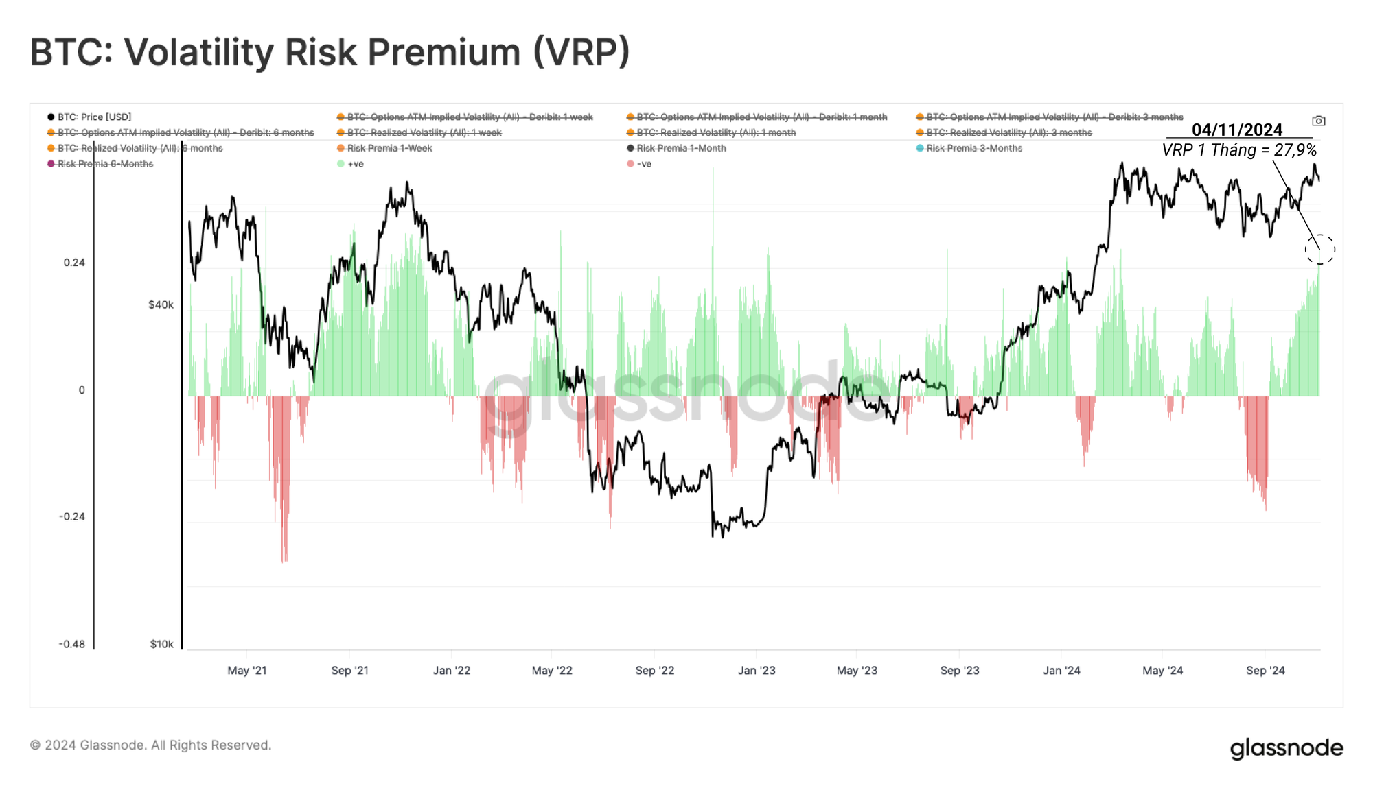Hiện tại, VRP 1 tháng nằm ở giá trị 27,9%, chỉ có 1,4% ngày giao dịch ghi nhận giá trị lớn hơn. Điều này làm nổi bật mức độ cực đoan của hồ sơ biến động được định giá vào thị trường quyền chọn.