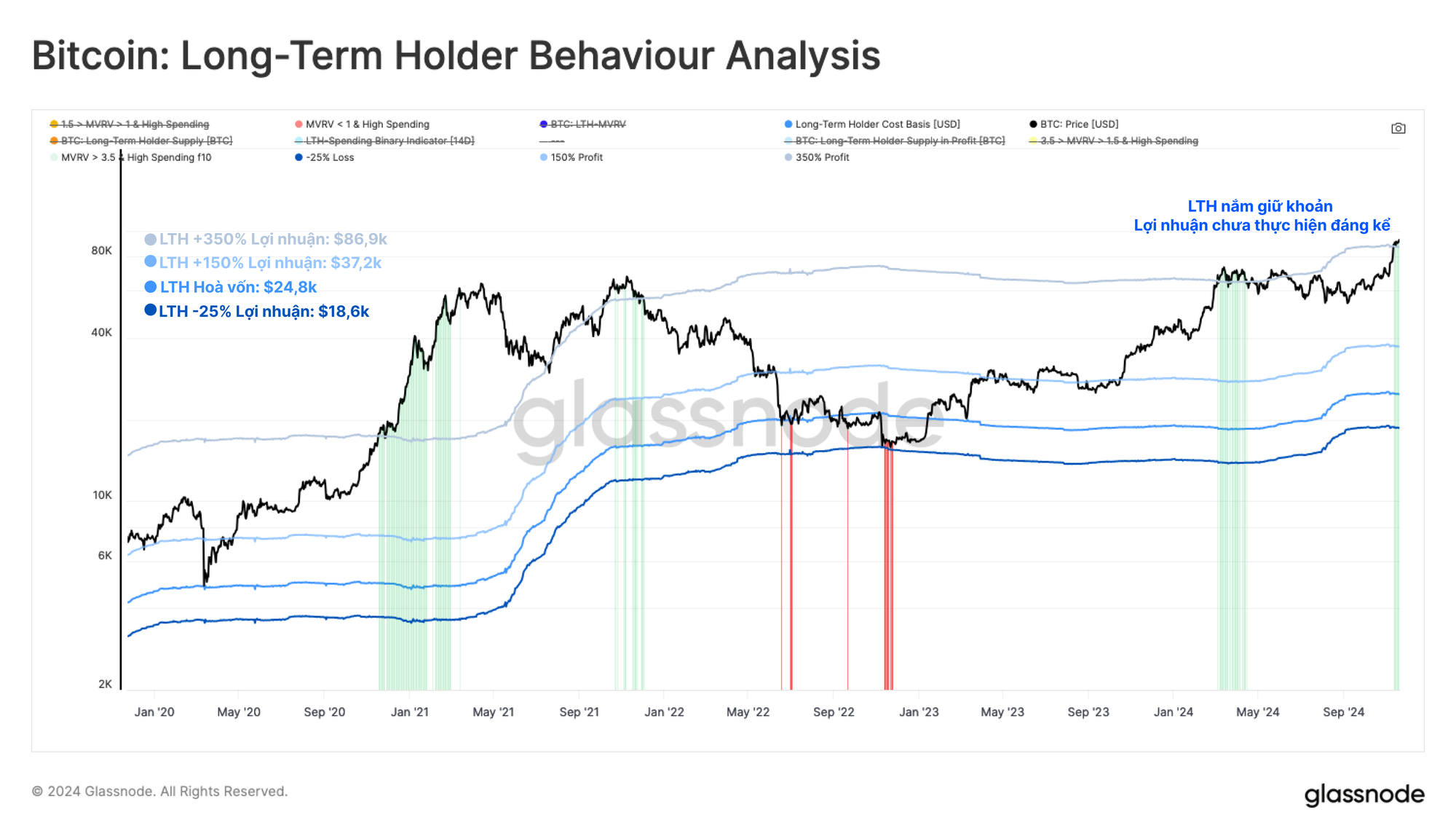 - Chốt lời (🟩): Các giai đoạn mà người nắm giữ dài hạn nắm giữ hơn +350% lợi nhuận và tăng chi tiêu.