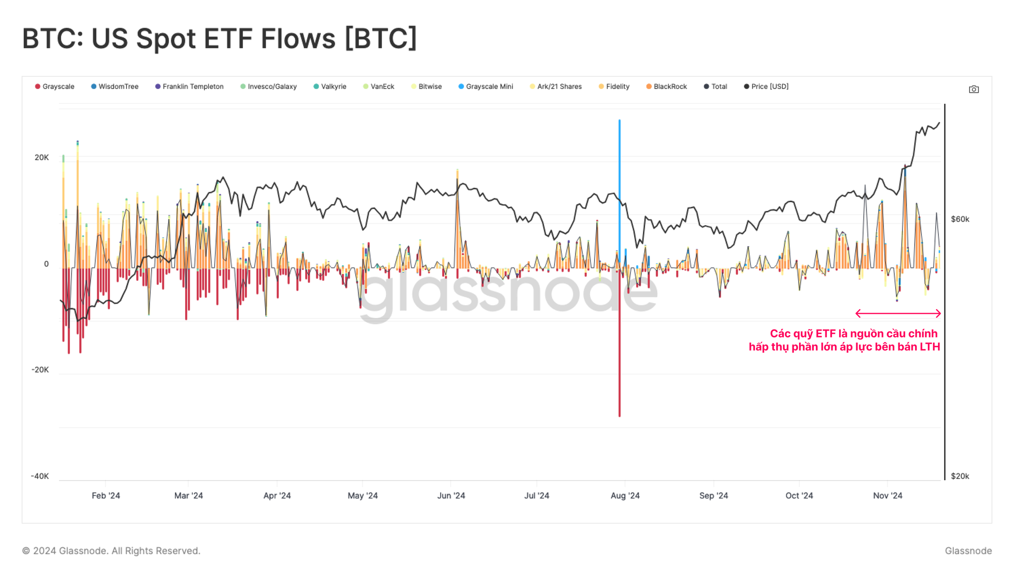 Tuy nhiên, kể từ ngày 13 tháng 11, áp lực bán LTH đã bắt đầu vượt qua dòng tiền ròng vào ETF, lặp lại mô hình đã được quan sát thấy vào cuối tháng 2 năm 2024, khi sự mất cân bằng giữa cung và cầu dẫn đến biến động thị trường gia tăng và sự tích luỹ sau đó.