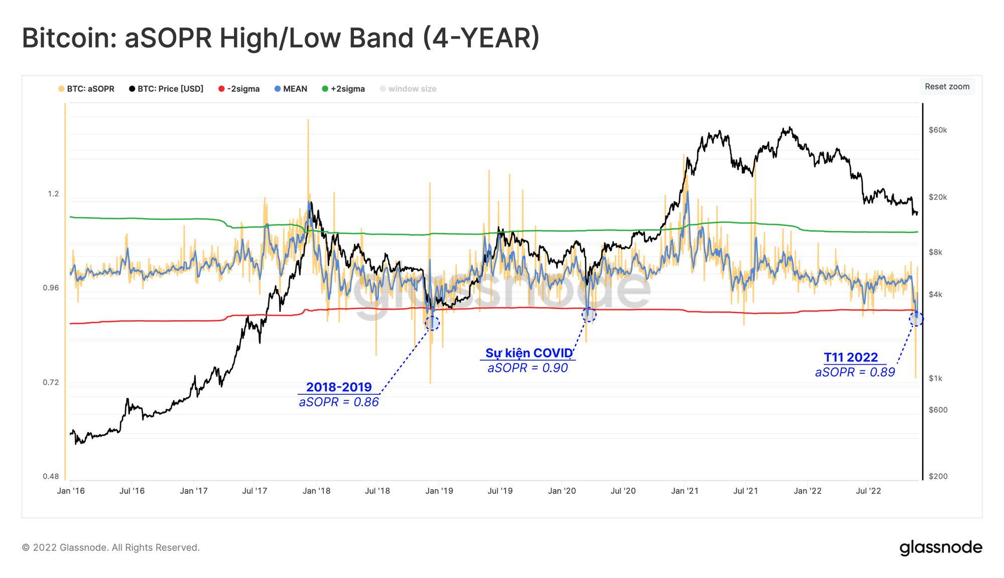 Cả khoản lỗ trên danh nghĩa lẫn khoản lỗ thực đều có quy mô lớn trong lịch sử. Ở đây, chúng tôi sử dụng chỉ báo aSOPR, các giá trị trên 1 báo hiệu khả năng sinh lời chiếm ưu thế, trong khi các giá trị dưới 1 biểu thị tổn thất tổng hợp.