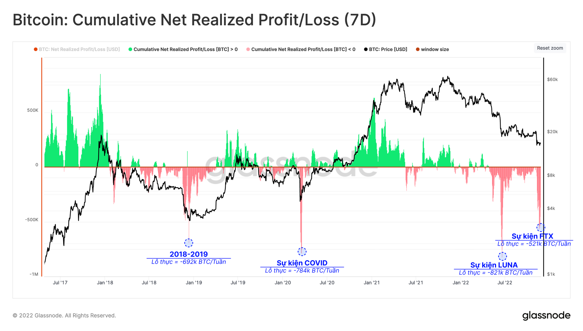 Biểu đồ bên dưới hiển thị lãi/lỗ ròng tích lũy trong 7 ngày, được tính bằng BTC để so sánh giữa các chu kỳ. Đáng chú ý, trong tuần trước thị trường đã ghi nhận một khoản lỗ ròng tương đương 521,000 BTC, một lần nữa gần với mức lớn nhất mọi thời đại được ghi nhận trong lịch sử.