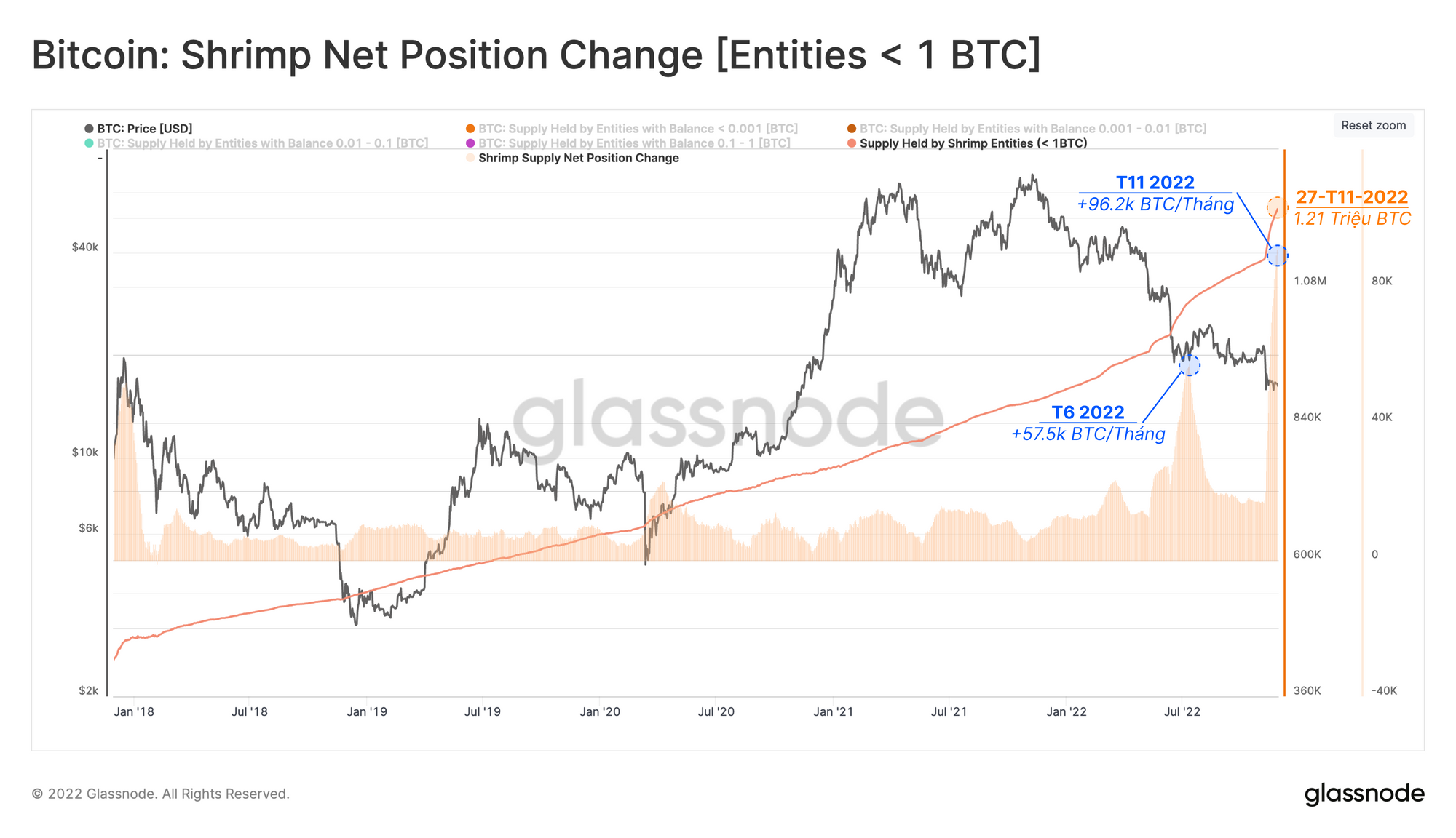 Trong số tất cả các nhóm, các thực thể nắm giữ < 1 BTC (còn được gọi là Tôm 🦐) đã ghi nhận hai đợt tăng số dư ATH riêng biệt trong 5 tháng qua. Nhóm Tôm đã thêm hơn 96,200 BTC vào ví của họ kể từ khi FTX sụp đổ và hiện nắm giữ hơn 1.21 triệu BTC, tương đương 6.3% nguồn cung lưu thông.