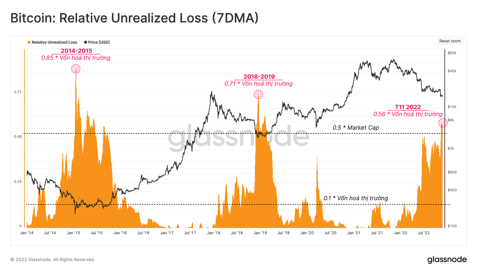 Theo dõi mức trung bình hàng tuần của chỉ báo này cho thấy rằng tại các thời điểm cực đoan của thị trường gấu trước đó, các nhà đầu tư đã gánh chịu khoản lỗ vượt quá 50% tổng giá trị vốn hóa thị trường tại thời điểm đó. Chỉ báo này gần đây đã đạt mức cao nhất là 56%, mức cao nhất trong chu kỳ này và có thể so sánh với các mức giá sàn trong các thị trường gấu trước đây.