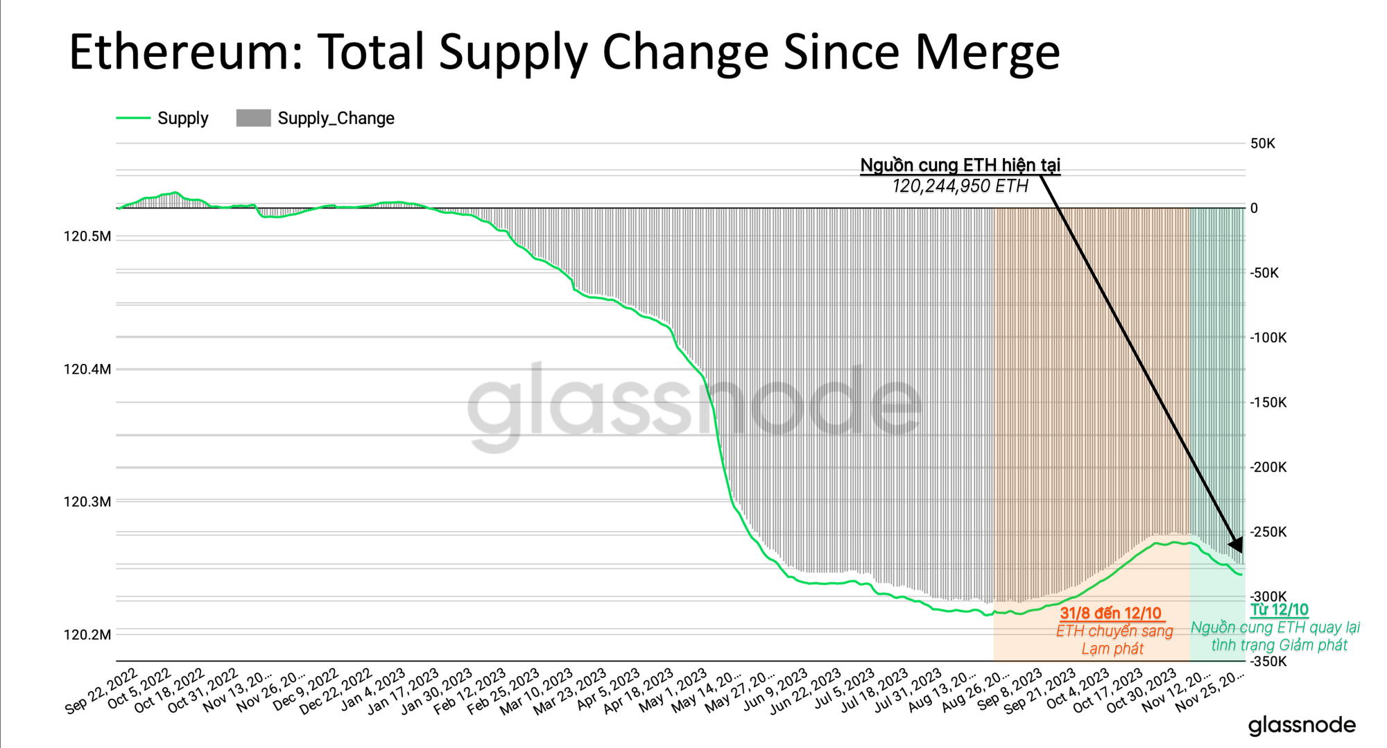 Trong những tuần gần đây, do tỷ lệ phát hành giảm và khối lượng nguồn cung bị đốt lớn hơn, tổng nguồn cung ETH một lần nữa trở lại tình trạng giảm phát ròng.