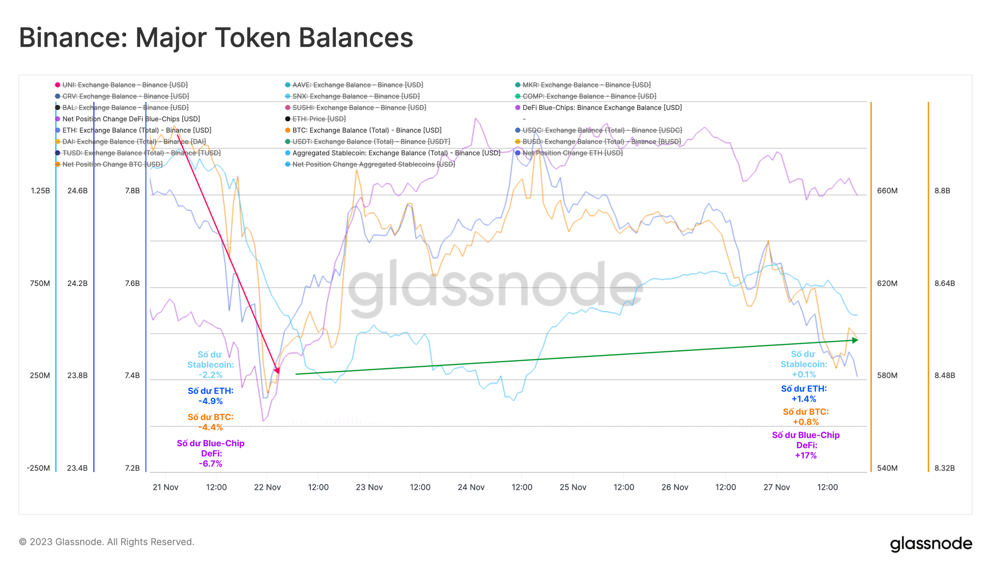 Sau tin tức này, sàn giao dịch Binance đã trải qua sự gia tăng trong hoạt động rút tiền trên các tài sản lớn. Số dư tổng hợp của một loạt “blue-chip” DeFi đã giảm -6.7% trong vòng 24 giờ đầu tiên, trong khi số dư BTC, ETH và Stablecoin lần lượt giảm -4.4%, -4.9% và -2.2%.
