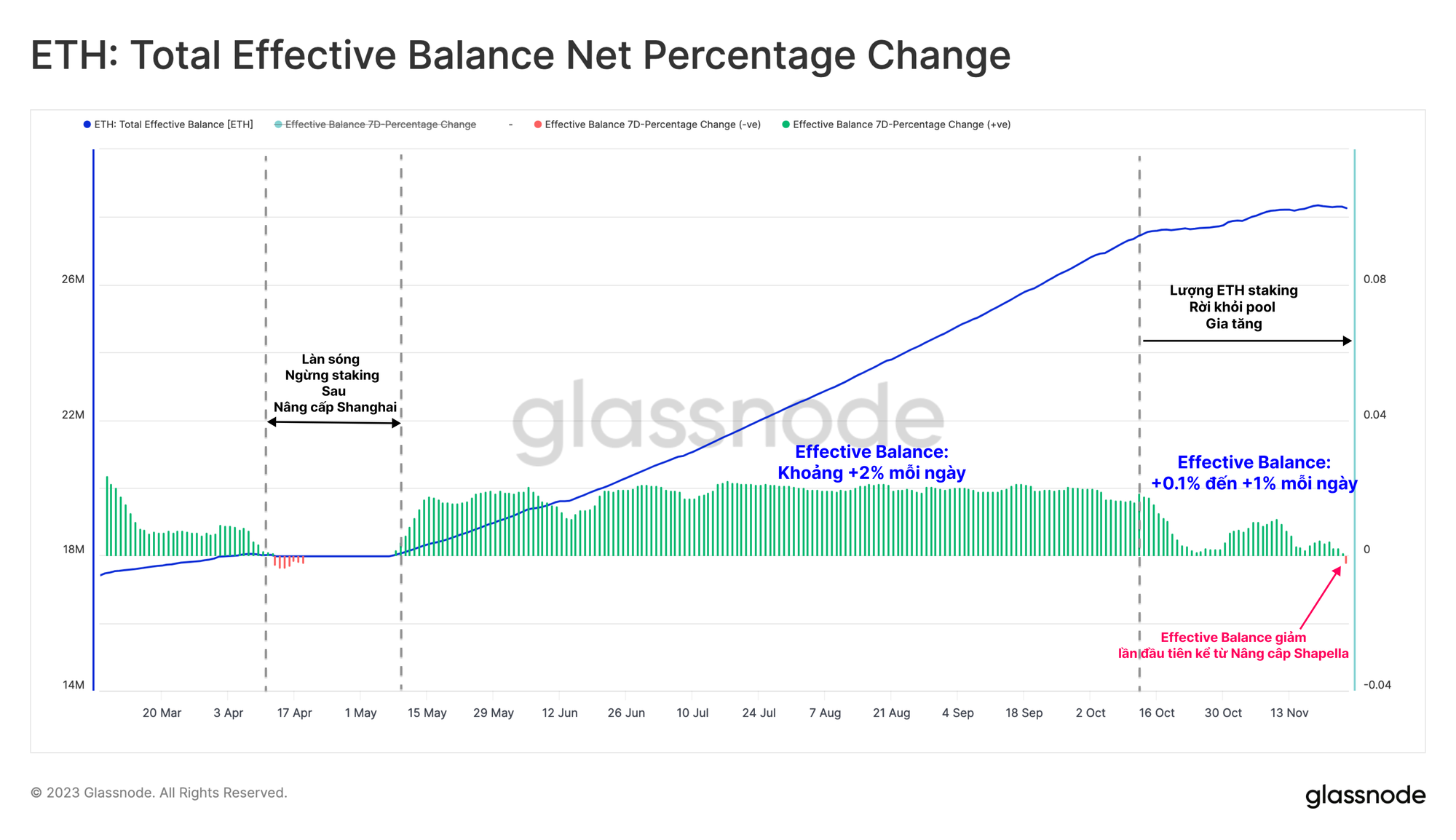 Do đó, chỉ số Total Effective Balance, đại diện cho ETH trong Pool Staking, đang tích cực tham gia vào Đồng thuận Proof-of-Stake, đã tăng trưởng chậm lại và hiện đang trải qua đợt suy giảm đầu tiên kể từ nâng cấp Shanghai.