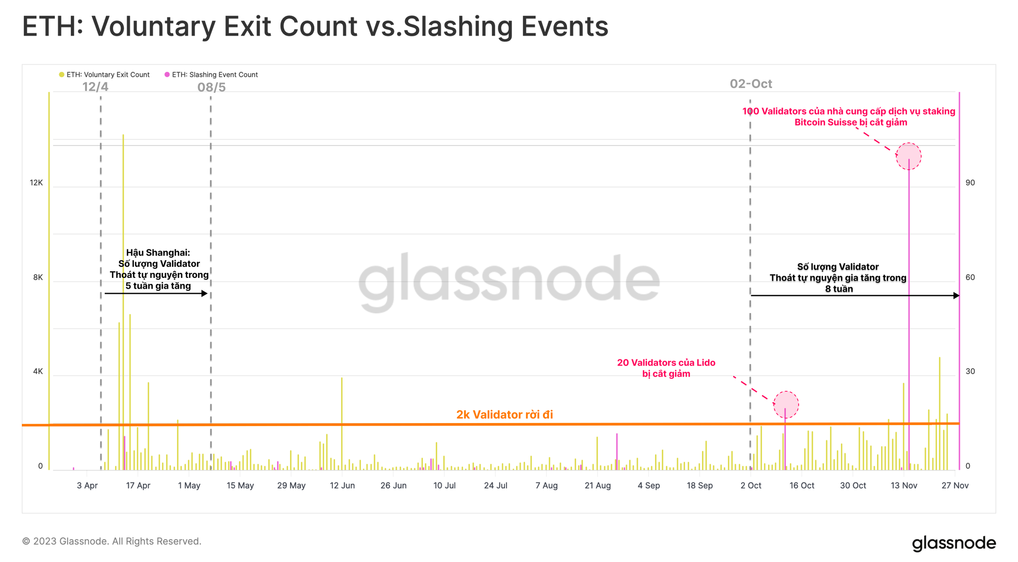 Khi kiểm tra kỹ hơn các validator đã thoát, chúng tôi có thể thấy nó được thúc đẩy chủ yếu bởi các lần thoát tự nguyện trong tám tuần qua. Các lần thoát tự nguyện đề cập đến những người tham gia staking chọn cách thoát khỏi pool một cách độc lập. Điều này khác với cắt giảm (slashing), là một hình phạt áp dụng cho những validator vi phạm các quy tắc giao thức.