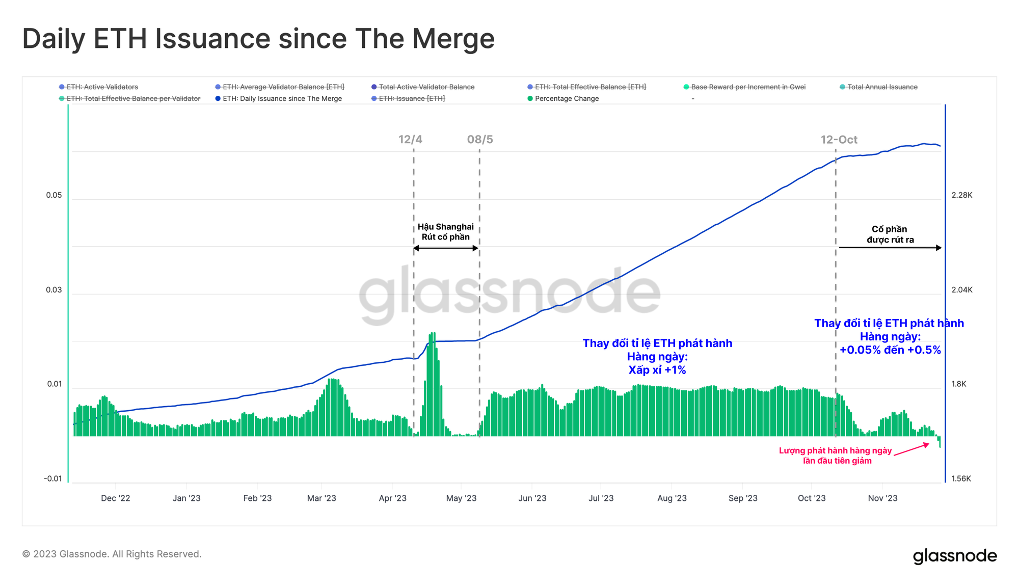 Khi tốc độ tăng trưởng của các validator chậm lại và giảm sút, việc phát hành ETH hàng ngày cũng có sự chậm lại tương ứng. Trong 7 ngày qua, tốc độ phát hành ETH đã chậm lại lên tới 0.5% mỗi ngày. Đáng chú ý là tỷ lệ phát hành đã giảm lần đầu tiên trong những ngày gần đây.
