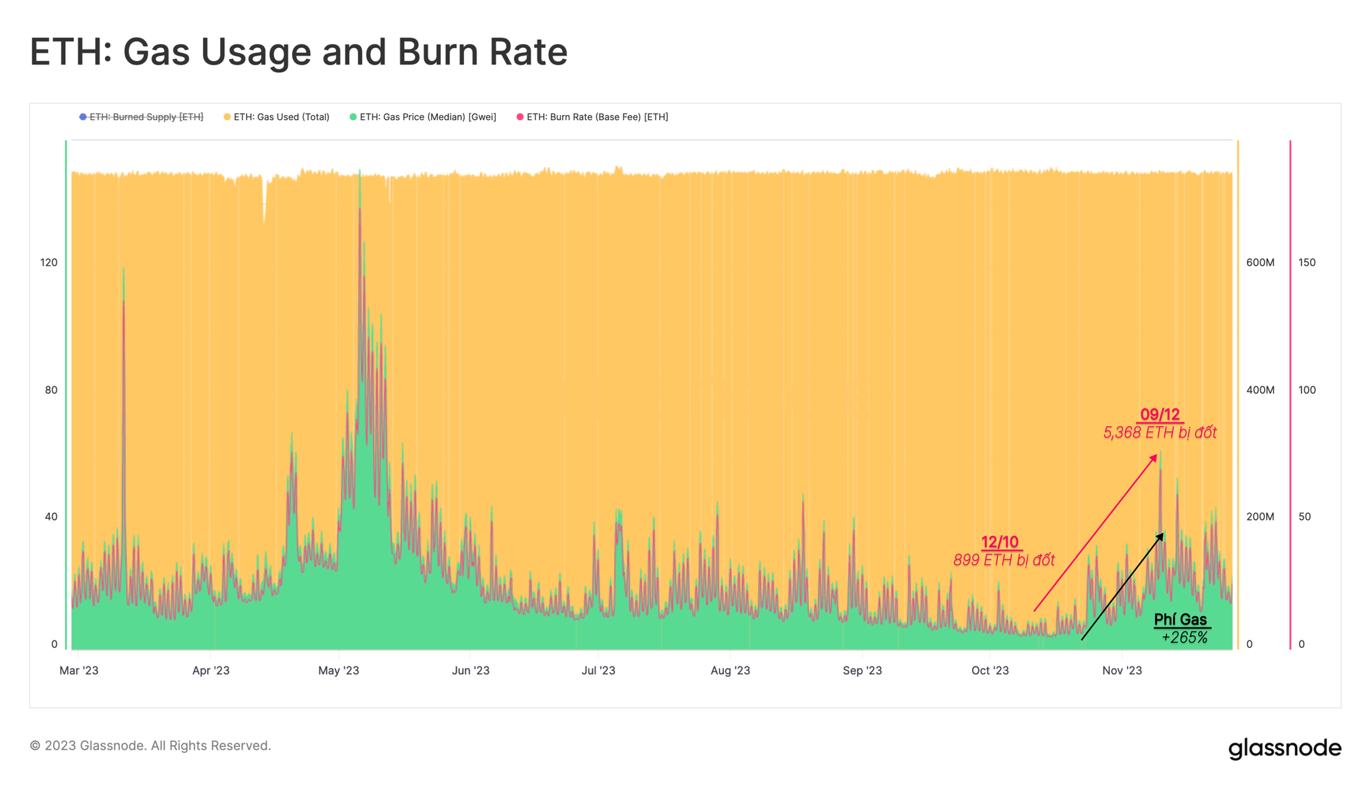 Cùng với việc phí gas tăng cao, cho thấy nhu cầu giao dịch ngày càng tăng trên mạng Ethereum, phí ETH bị đốt hàng ngày cũng tăng theo. Vào tháng 10, chúng tôi thấy số phí ETH bị đốt lên tới 899 ETH mỗi ngày. Trong gần một tháng tiếp theo, số phí tích lũy bị đốt hiện đã lên tới 5.368 ETH.