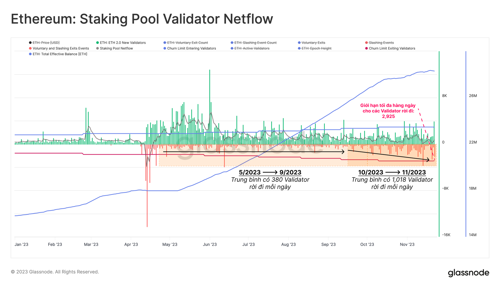 - Số lượng validator rời đi ngày càng tăng đã góp phần làm giảm lượng phát hành ETH hàng ngày, điều này có liên quan đến lượng ETH hoạt động trong pool staking.
