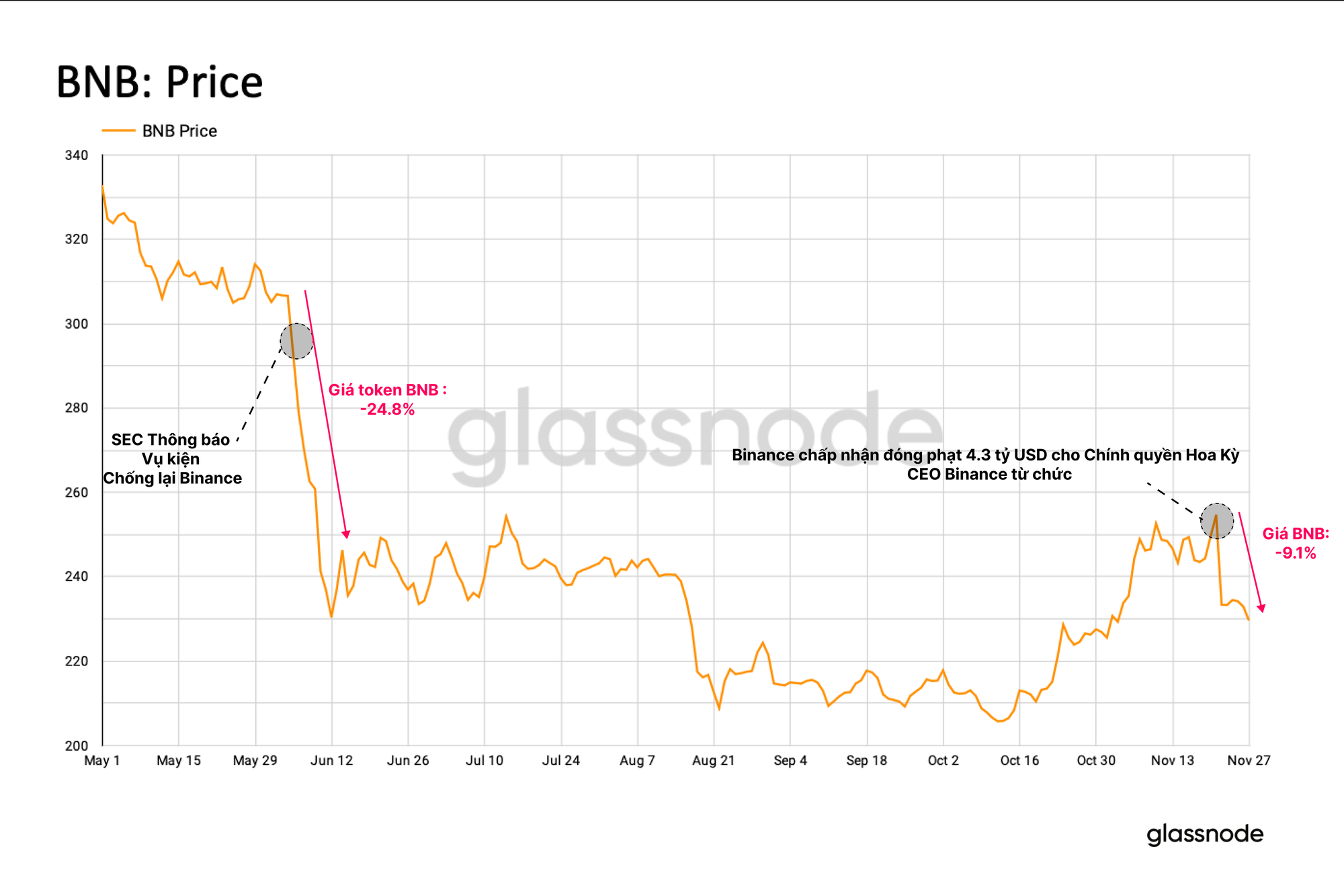 Sau thông báo này, giá BNB đã giảm -9.1%. Tuy nhiên, phản ứng này của thị trường tương đối ôn hòa so với những lần giảm giá trước đó, chẳng hạn như mức giảm -24% khi SEC công bố các cáo buộc hồi đầu năm.