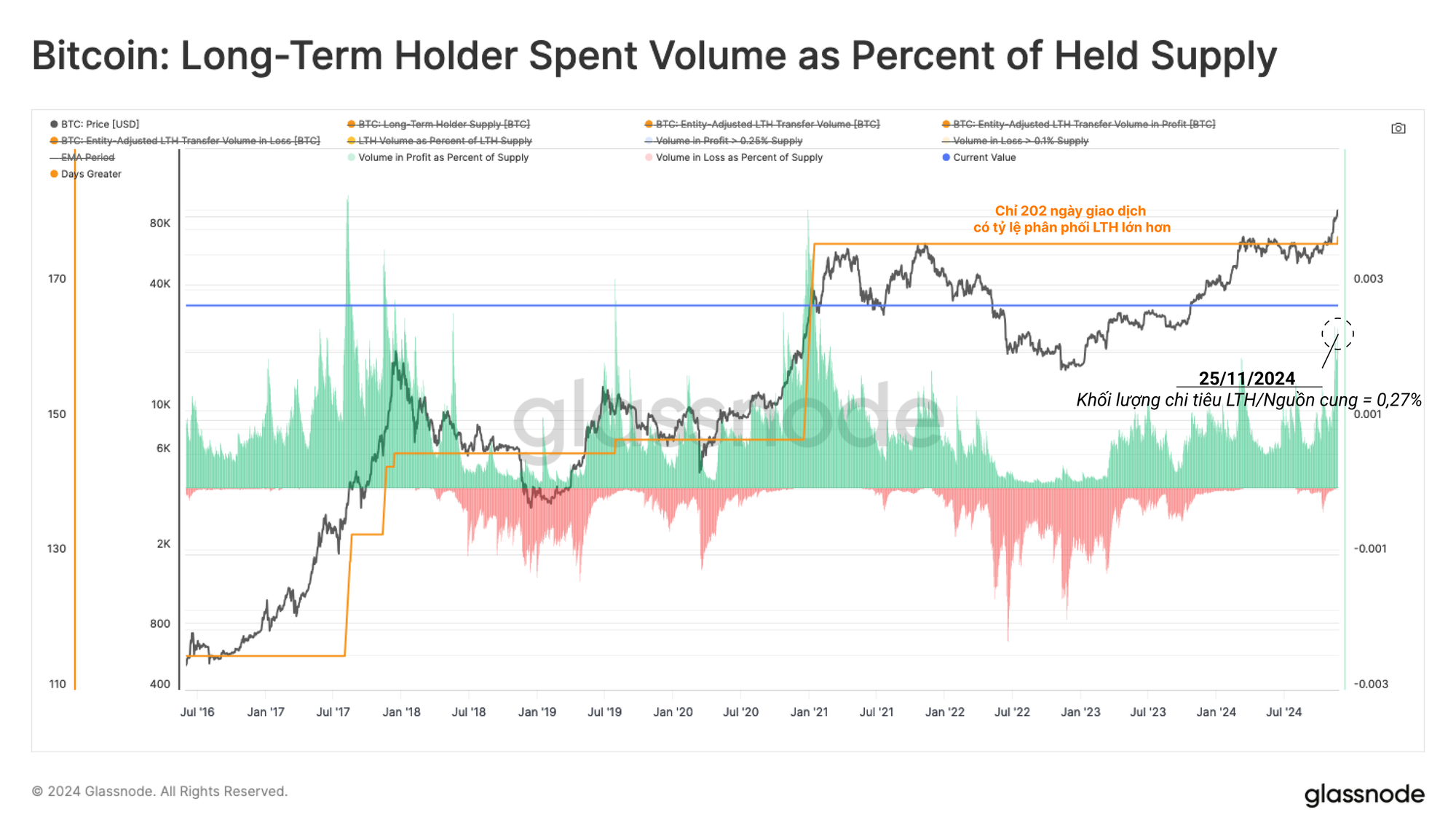 Chúng tôi thấy một câu chuyện tương tự khi đánh giá tỷ lệ phần trăm nguồn cung LTH tổng hợp được giao dịch từ vị thế có lời. Hiện tại, trung bình 0,27% nguồn cung LTH đang được phân phối hàng ngày, với chỉ 177 trong số tất cả các ngày giao dịch ghi nhận tỷ lệ phân phối cao hơn.