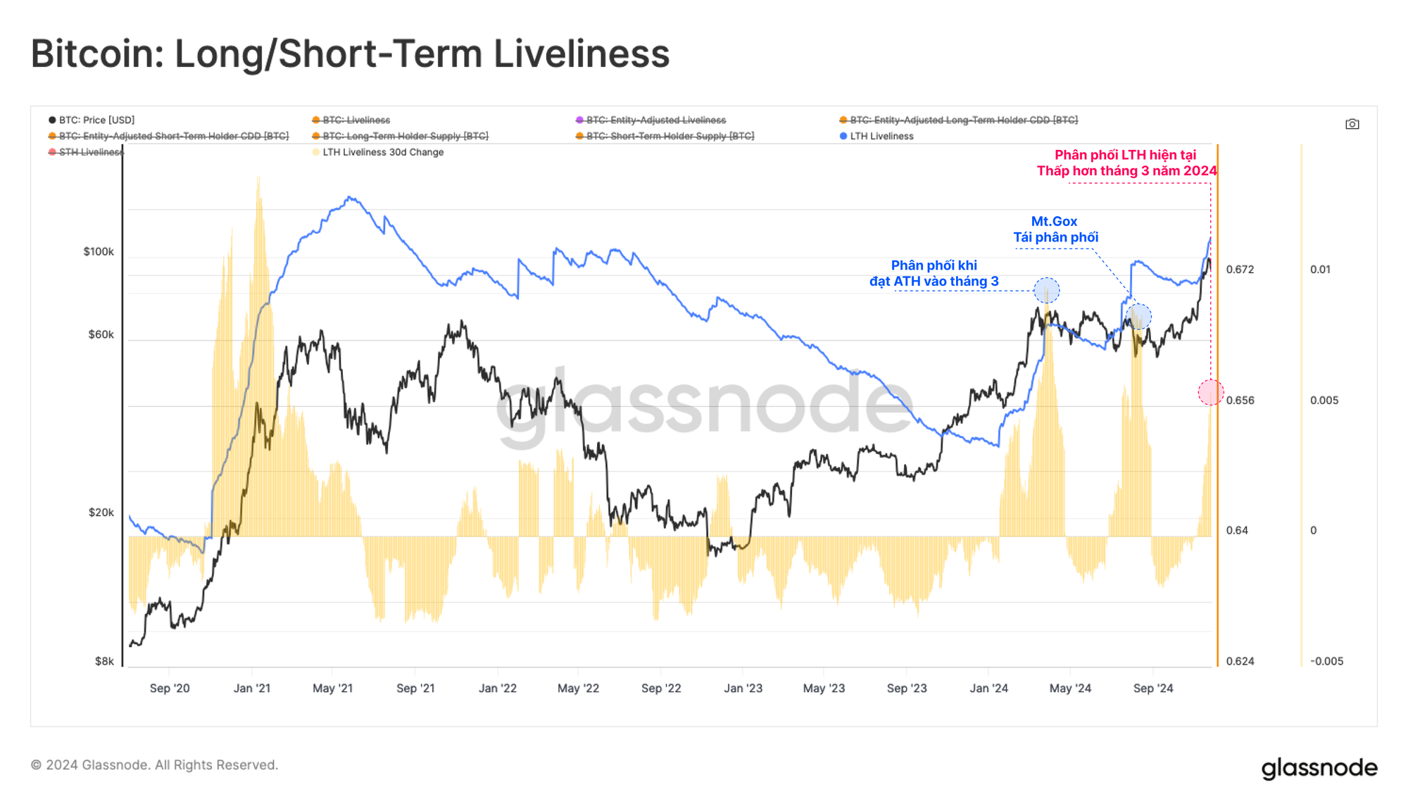 - Khi giá Bitcoin tăng lên gần $100k, những Người nắm giữ dài hạn đã bắt đầu phân phối hơn 507k BTC, đây là con số đáng kể nhưng vẫn ít hơn mức 934k BTC được bán ra trong đợt tăng giá vào tháng 3.