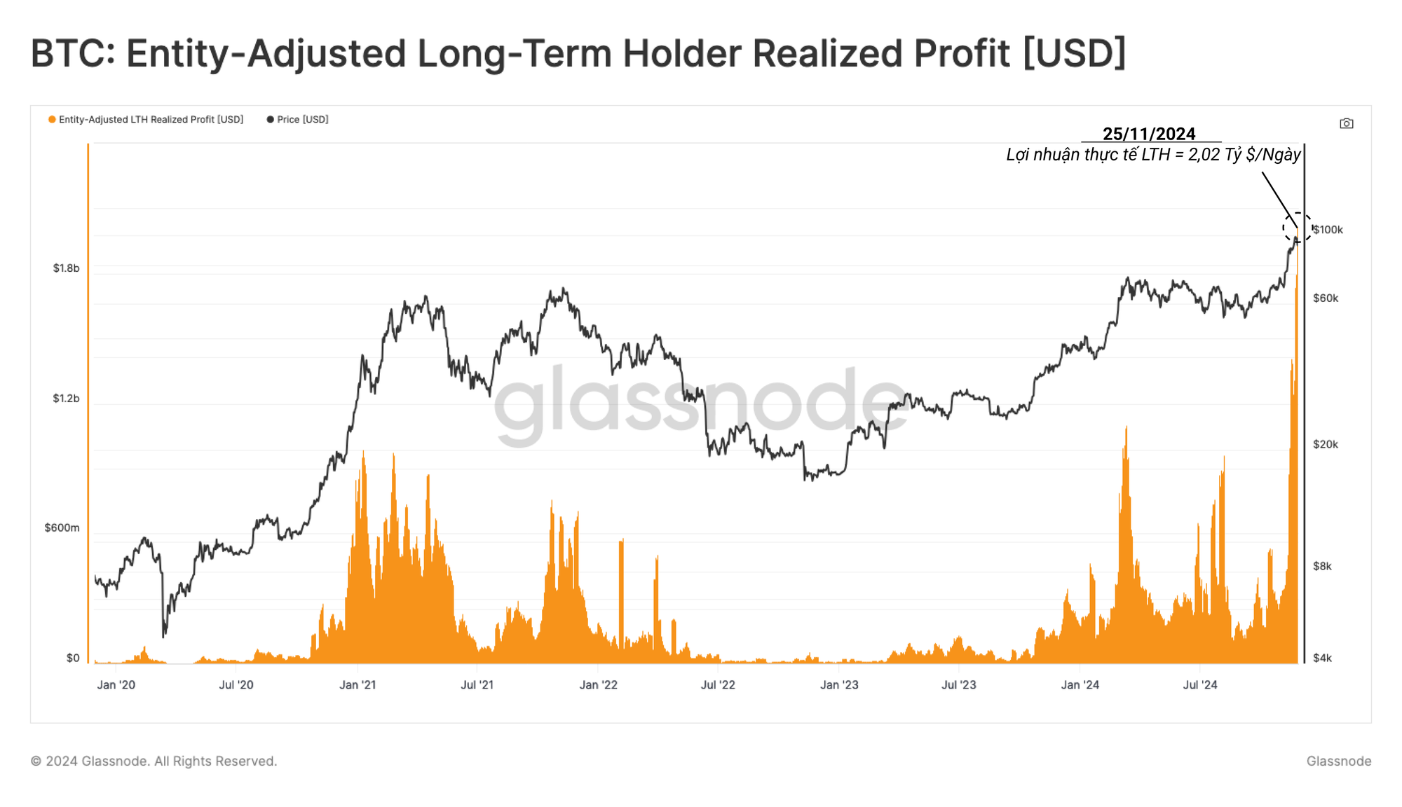 - Những người nắm giữ dài hạn đang chốt lời khoản lợi nhuận đáng kể, thiết lập mức ATH mới là 2,02 tỷ USD lợi nhuận thực tế hàng ngày.