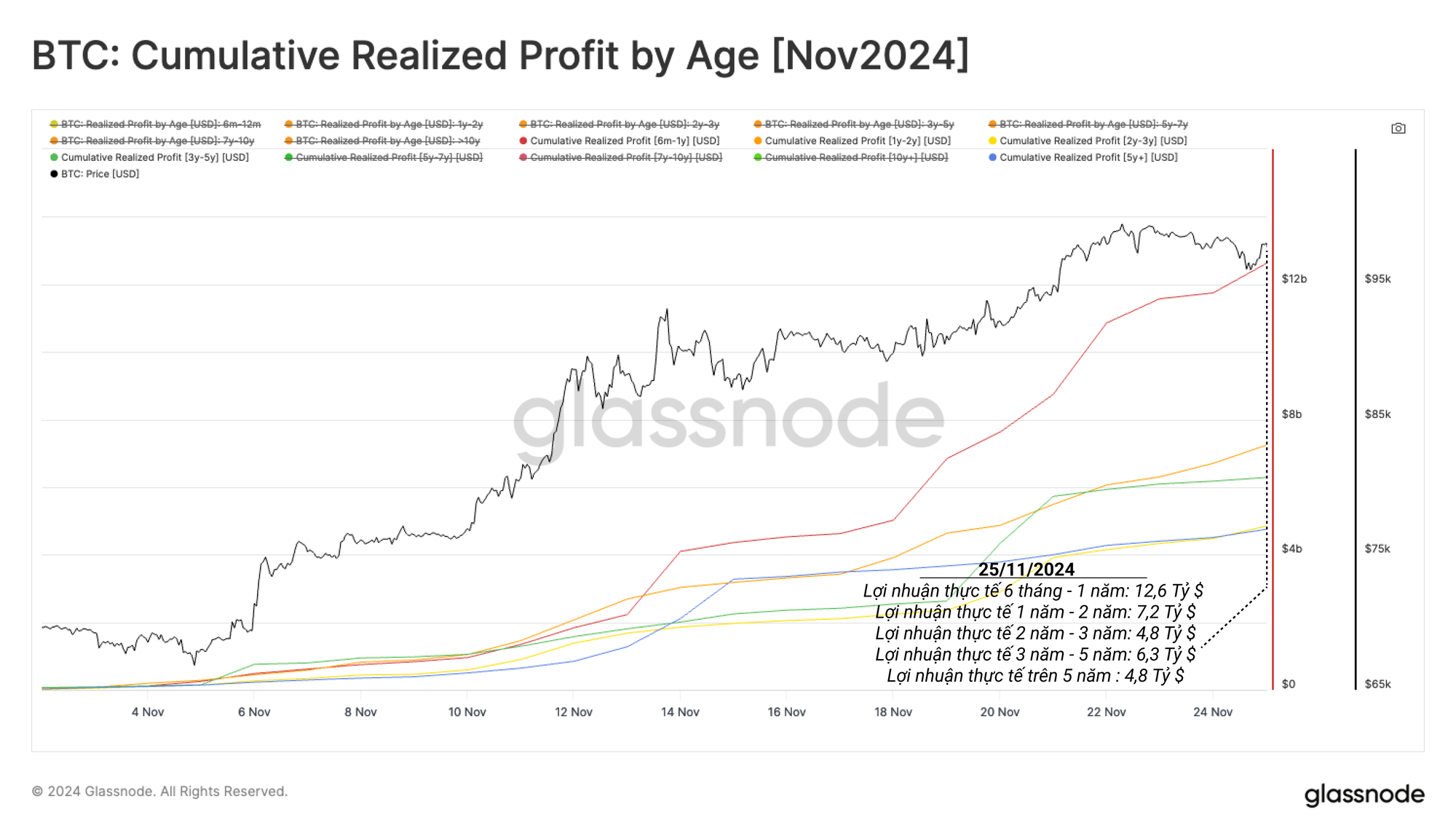 Chúng tôi có thể sử dụng phân tích về độ tuổi của số liệu lợi nhuận thực tế để đánh giá nhóm phụ nào đang đóng góp nhiều nhất vào áp lực bán. Tại đây, chúng tôi tính toán khối lượng chốt lời tích lũy theo độ tuổi kể từ đầu tháng 11 năm 2024.
