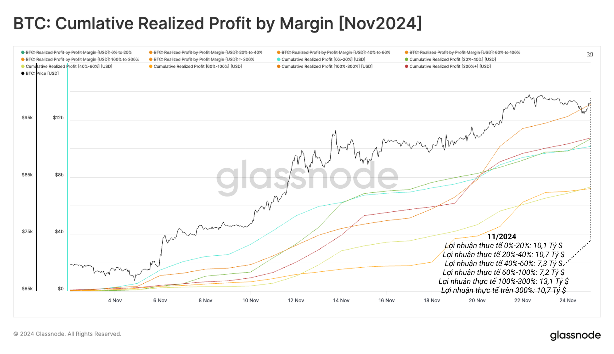 Sau một loạt các ATH mới, Bitcoin đã tiến đến rất gần mức giá $100k. Biến động giá bùng nổ có xu hướng dẫn đến sự gia tăng đáng kể lợi nhuận chưa thực hiện của người nắm giữ và để phản ứng lại những Người nắm giữ dài hạn đã tăng cường phân phối.
