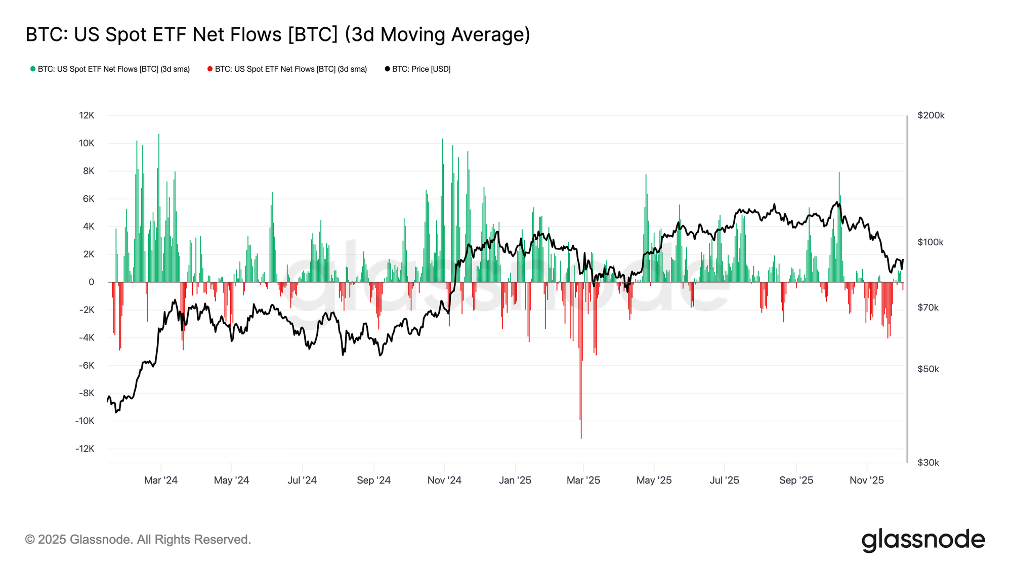 Chuyển sang thị trường giao ngay, các quỹ Bitcoin ETF tại Hoa Kỳ đã chứng kiến dòng vốn ròng suy giảm đáng kể, với mức trung bình 3 ngày trượt mạnh vào vùng âm trong suốt tháng 11. Điều này đánh dấu một sự đảo chiều rõ rệt so với trạng thái dòng tiền vào bền bỉ từng hỗ trợ giá hồi đầu năm, và phản ánh sự nguội lạnh của việc phân bổ vốn mới vào tài sản này. Dòng tiền chảy ra đã diễn ra trên diện rộng ở khắp các đơn vị phát hành, cho thấy quan điểm thận trọng hơn từ những tổ chức tham gia khi điều kiện thị trường suy yếu.
