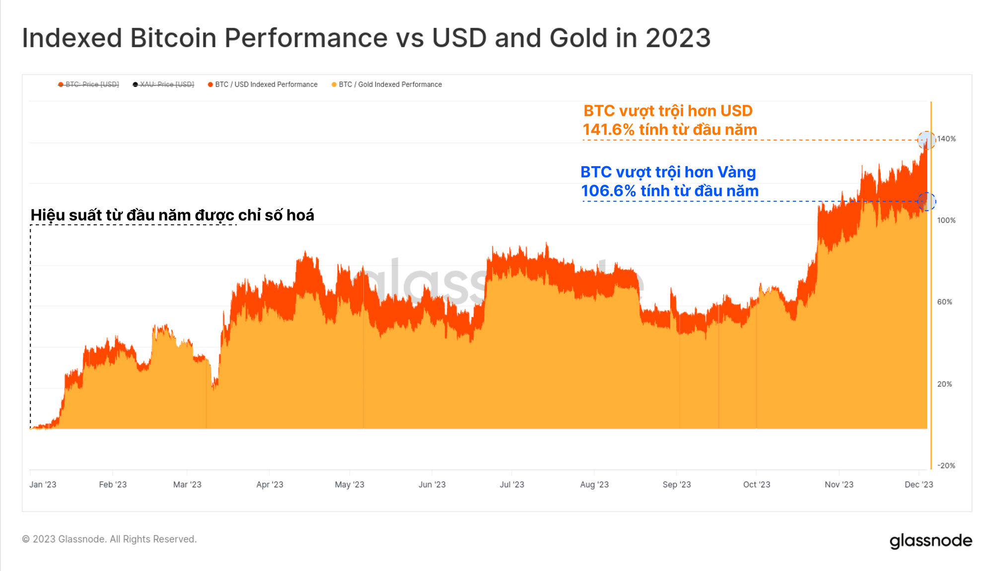Bitcoin tiếp tục dẫn đầu như một trong những tài sản hoạt động tốt nhất trên toàn cầu năm 2023. Không chỉ tăng giá hơn 140% so với đầu năm mà Bitcoin còn tăng gấp đôi so với Vàng và vẫn thống trị so với phần còn lại của thị trường tài sản kỹ thuật số.