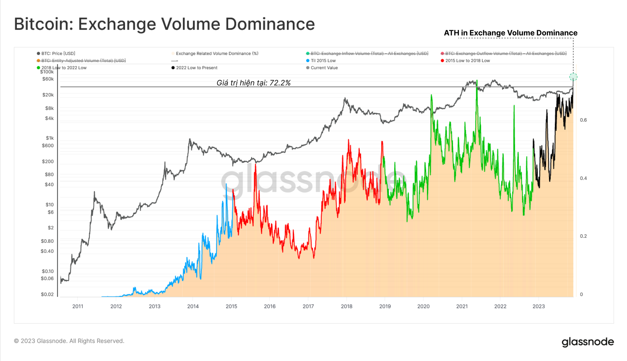 Mặc dù số lượng giao dịch đến và đi từ các sàn giao dịch tương đối thấp nhưng khối lượng vào/ra chiếm 72.2% tổng khối lượng on-chain, bằng với ATH trước đó. Điều này nhấn mạnh một tỷ lệ đáng kể thông lượng on-chain có liên quan đến hoạt động sàn giao dịch, khi các nhà đầu tư gửi và rút tiền với quy mô và khối lượng ngày càng tăng.
