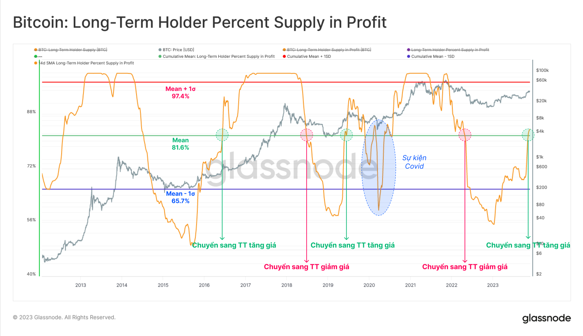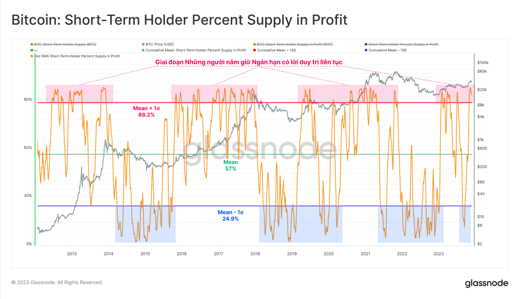 Nhóm Người nắm giữ Ngắn hạn hầu như hoàn toàn có lãi, với hơn 95% cổ phần nắm giữ của họ có cơ sở chi phí thấp hơn giá giao ngay hiện tại. Chỉ số này cao hơn độ lệch chuẩn dài hạn +1 và một lần nữa về mặt lịch sử có liên quan đến xu hướng tăng.