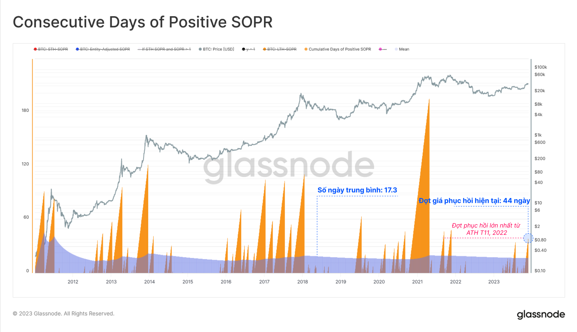 Chúng tôi có thể mở rộng thêm bằng cách theo dõi số ngày liên tiếp trong đó cả ba biến thể SOPR đều giao dịch trên 1.0. Đợt phục hồi hiện tại đã chứng kiến tình trạng này kéo dài trong 44 ngày, dài hơn thời gian trung bình là 17 ngày và cũng là khoảng thời gian dài nhất kể từ ATH tháng 11 năm 2021.