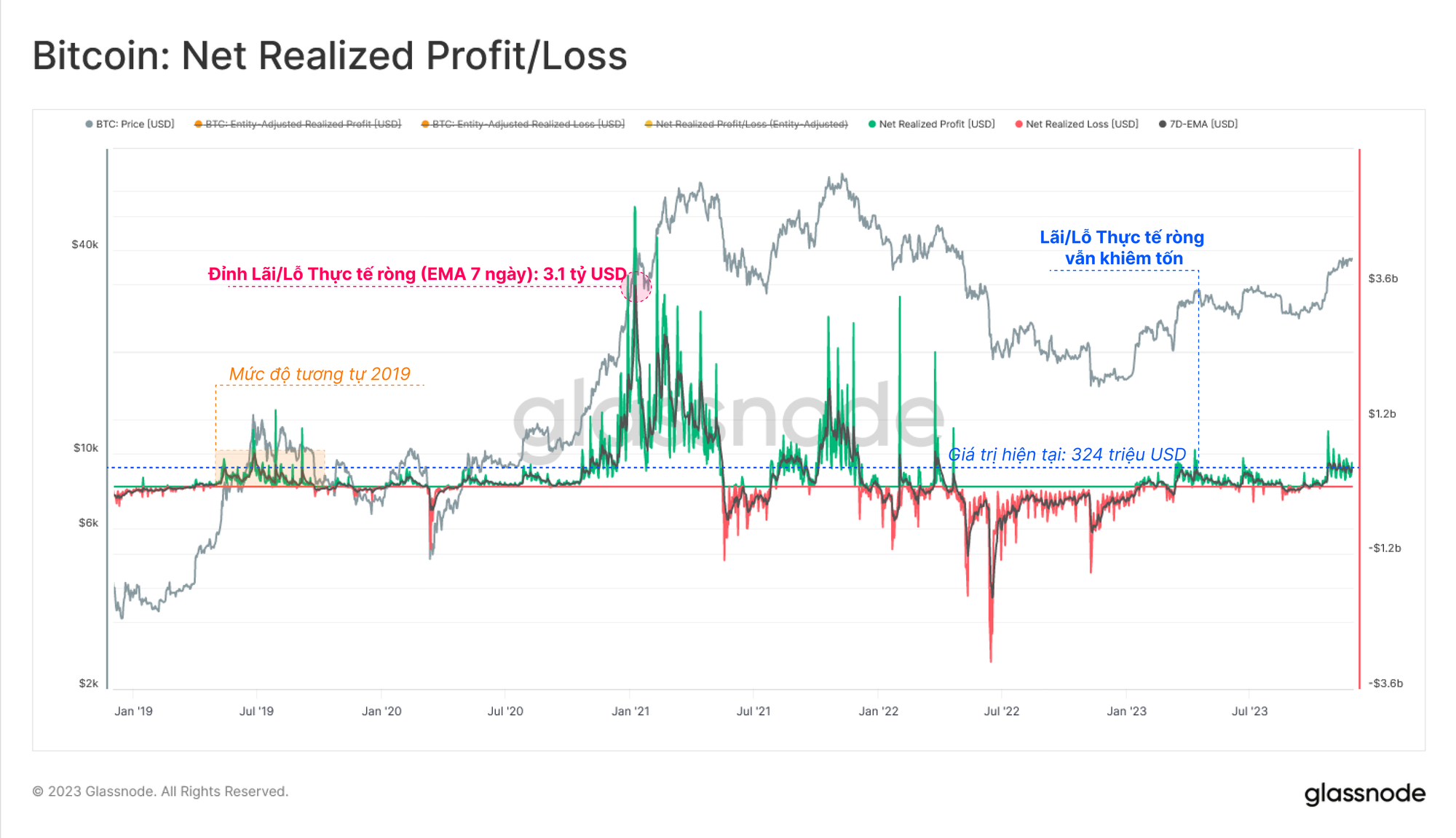 Lợi nhuận thực tế ròng tính theo USD trong thị trường đã đạt 324 triệu USD/ngày, vẫn thấp hơn các đỉnh trong giai đoạn sau của bull market năm 2021 (hơn 3 tỷ USD/ngày).