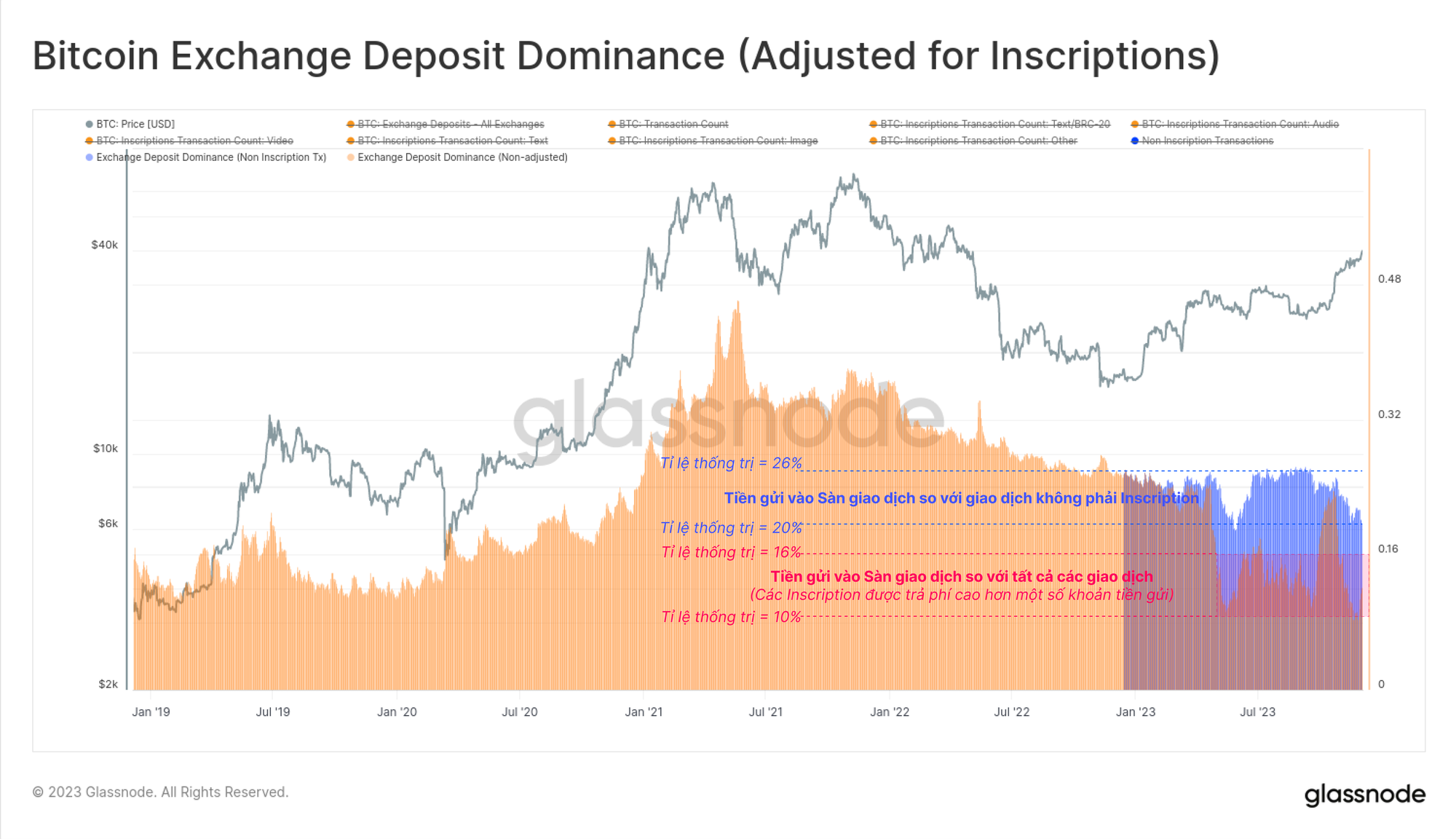 Tuy nhiên, không giống như các chu kỳ trước, giờ đây chúng tôi phải xem xét số lượng giao dịch trong bối cảnh xuất hiện người mua dung lượng khối mới: Các bản khắc (Inscriptions). Vì mỗi khối Bitcoin có giới hạn dữ liệu dung lượng khối hạn chế, nên những khoảng thời gian mà Inscription được trả phí cao hơn có thể “loại bỏ” các khoản tiền gửi đến sàn giao dịch đang được trả phí thấp hơn.