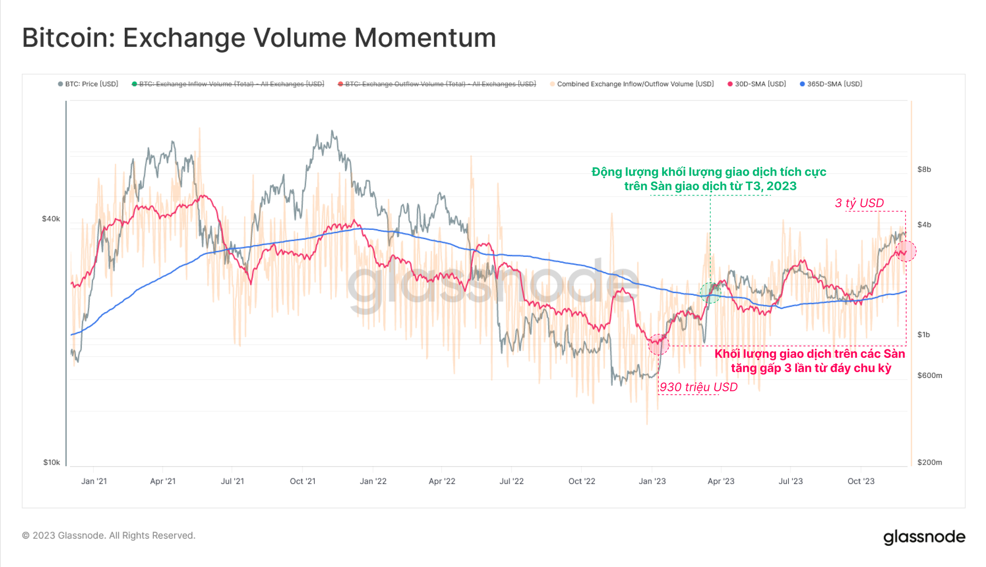 Xem xét từ góc độ khối lượng on-chain, chúng ta có thể thấy dòng tiền vào và ra khỏi các sàn giao dịch từ đầu năm đến nay đã tăng đáng kể từ 930 triệu USD lên hơn 3 tỷ USD (+220%). Điều này nhấn mạnh sự quan tâm ngày càng tăng của các nhà đầu tư đối với hoạt động giao dịch, tích lũy, đầu cơ và sử dụng các sàn giao dịch cho dịch vụ của họ.