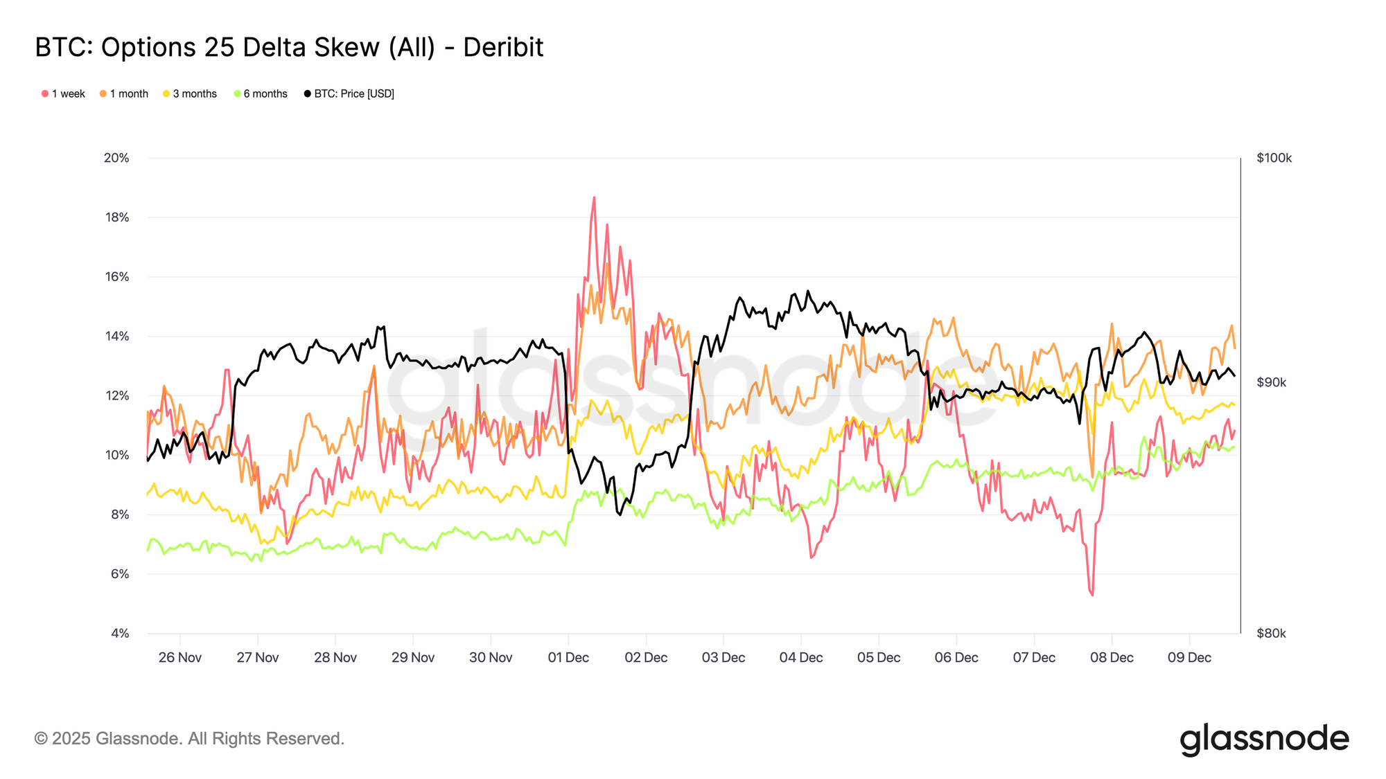 Bổ sung cho sự gia tăng biến động ở kỳ hạn ngắn, việc bảo vệ rủi ro giảm giá một lần nữa đang đòi hỏi mức phí cao. Độ lệch 25-delta, thước đo chi phí tương đối giữa quyền chọn bán và quyền chọn mua tại cùng một mức delta, đã tăng khoảng 11% ở kỳ hạn một tuần, cho thấy sự gia tăng rõ rệt trong nhu cầu mua bảo hiểm chiều giảm ngắn hạn trước cuộc họp FOMC.