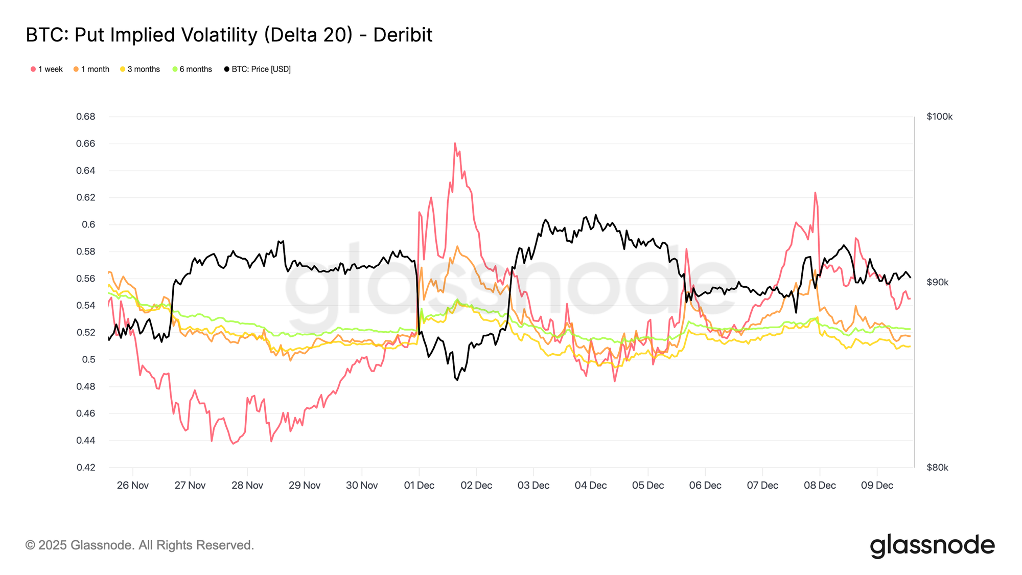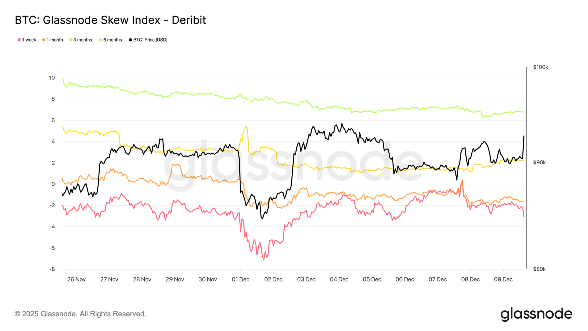 Độ lệch vẫn đồng đều trên các kỳ hạn khác nhau, dao động từ 10,3% đến 13,6%. Sự nén lại này cho thấy sự ưu tiên đối với việc bảo vệ bằng quyền chọn bán đang diễn ra trên diện rộng dọc theo đường cong kỳ hạn, phản ánh một thiên hướng phòng ngừa rủi ro nhất quán thay vì sự căng thẳng cục bộ giới hạn ở kỳ hạn ngắn.
