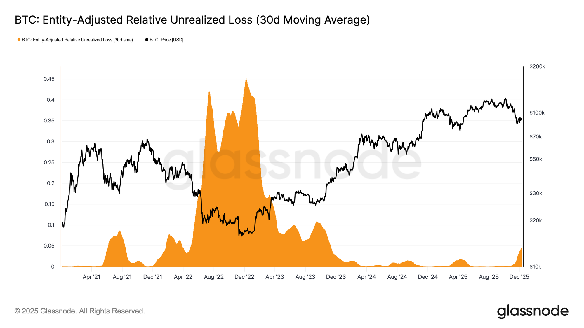 Chỉ số Thua lỗ Chưa thực hiện Tương đối (SMA 30 ngày) đã leo lên mức 4,4% sau gần hai năm duy trì dưới mức 2%, đánh dấu sự chuyển dịch từ giai đoạn hưng phấn sang giai đoạn căng thẳng và bất ổn gia tăng. Sự do dự này hiện đang định hình phạm vi giá, và để thoát khỏi tình trạng này sẽ cần một làn sóng thanh khoản và nhu cầu mới để xây dựng lại niềm tin.
