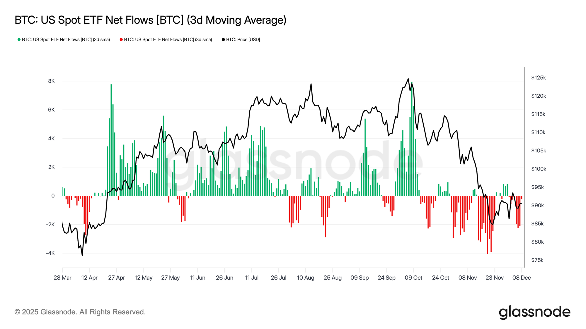 Chuyển sang các thị trường giao ngay, các quỹ ETF Bitcoin tại Hoa Kỳ lại ghi nhận thêm một tuần trầm lắng, với mức trung bình dòng tiền ròng trong 3 ngày liên tục duy trì dưới 0. Điều này kéo dài xu hướng hạ nhiệt đã bắt đầu từ cuối tháng 11 và đánh dấu sự khác biệt rõ rệt so với giai đoạn dòng tiền vào mạnh mẽ từng hỗ trợ đà tăng giá hồi đầu năm. Hoạt động rút vốn diễn ra đều đặn tại nhiều đơn vị phát hành lớn, nhấn mạnh quan điểm né tránh rủi ro ngày càng cao của các nhà phân bổ vốn tổ chức khi các điều kiện thị trường chung vẫn chưa ổn định.