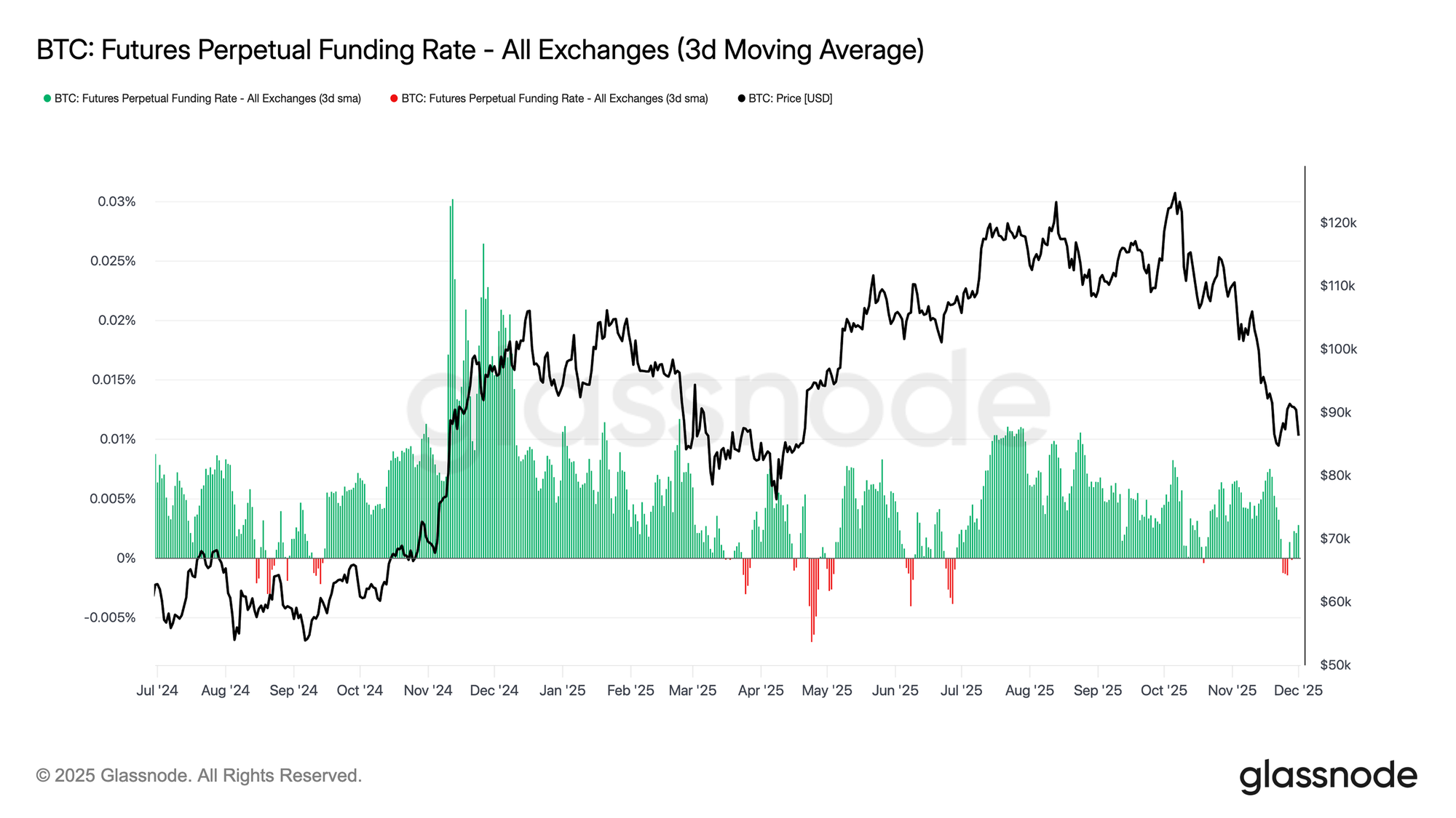 Trên thị trường hợp đồng vĩnh cửu, phí funding dao động quanh mức 0 hoặc âm nhẹ trong suốt tuần qua, nhấn mạnh sự rút lui liên tục của các vị thế mua đầu cơ. Các nhà giao dịch vẫn giữ trạng thái cân bằng hoặc phòng thủ, đóng góp rất ít áp lực định hướng giá thông qua đòn bẩy.