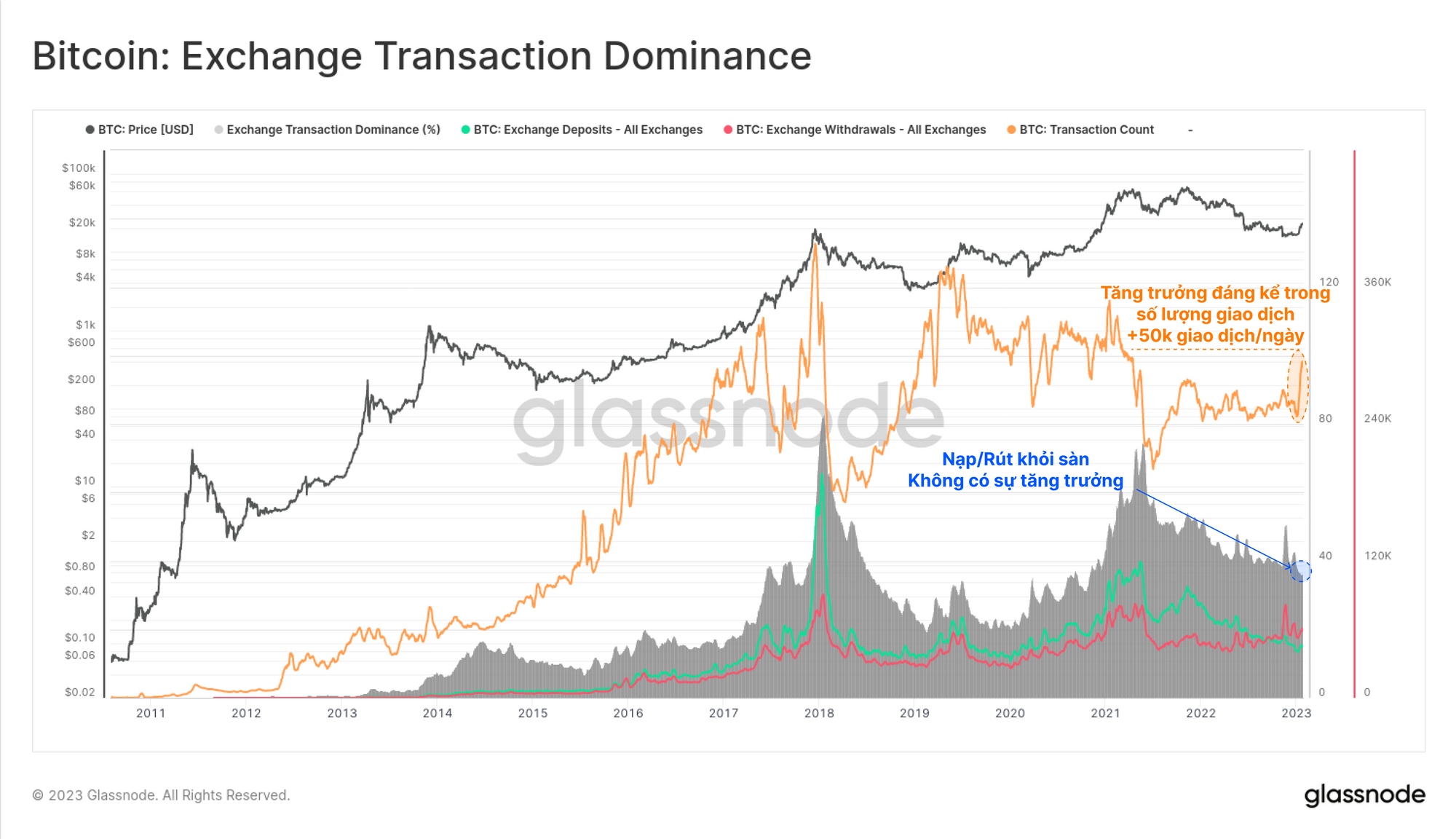 Các giao dịch Bitcoin trên chuỗi đã tăng vọt hơn 50,000 giao dịch mỗi ngày trong tuần này, tuy nhiên, chúng tôi không thấy sự gia tăng tương ứng về số lượng tiền gửi vào hoặc số lần rút tiền trên sàn giao dịch. Hiện tại, các giao dịch thông qua sàn chỉ chiếm 35% tổng số giao dịch, và vẫn đang trong xu hướng giảm kể từ mức cao nhất của thị trường vào tháng 5 năm 2021.