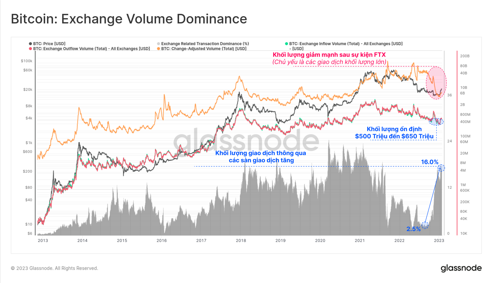 Khối lượng BTC tính theo USD chảy vào và ra khỏi các sàn giao dịch tương đối ổn định trong vài tuần qua, tuy nhiên sự thống trị tương đối của khối lượng giao dịch thông qua sàn đã tăng từ 2.5% lên hơn 16%.