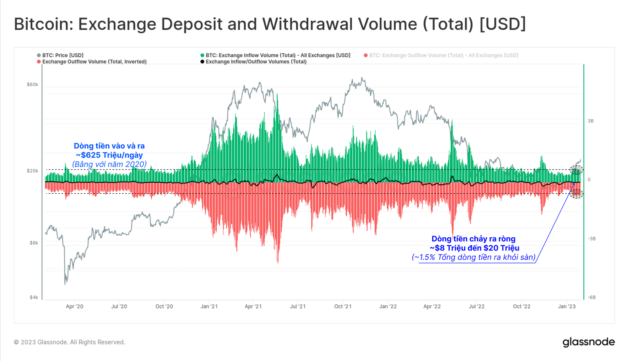 Tổng khối lượng tiền chảy vào và ra khỏi các sàn giao dịch hiện vào khoảng 625 triệu đô/ngày theo cả hai hướng (tổng cộng 1.25 tỷ đô/ngày). Trong đó lượng tiền chảy ra nhiều hơn khoảng 20 triệu đô và chiếm 1.5% tổng số cho thấy dòng tiền ra vào các sàn đang ở mức cân bằng đáng kể. Điều này khác với giai đoạn tháng 11 và 12 khi các sàn giao dịch chứng kiến dòng tiền chảy ra ròng từ 200 triệu đô la đến 300 triệu đô la mỗi ngày.