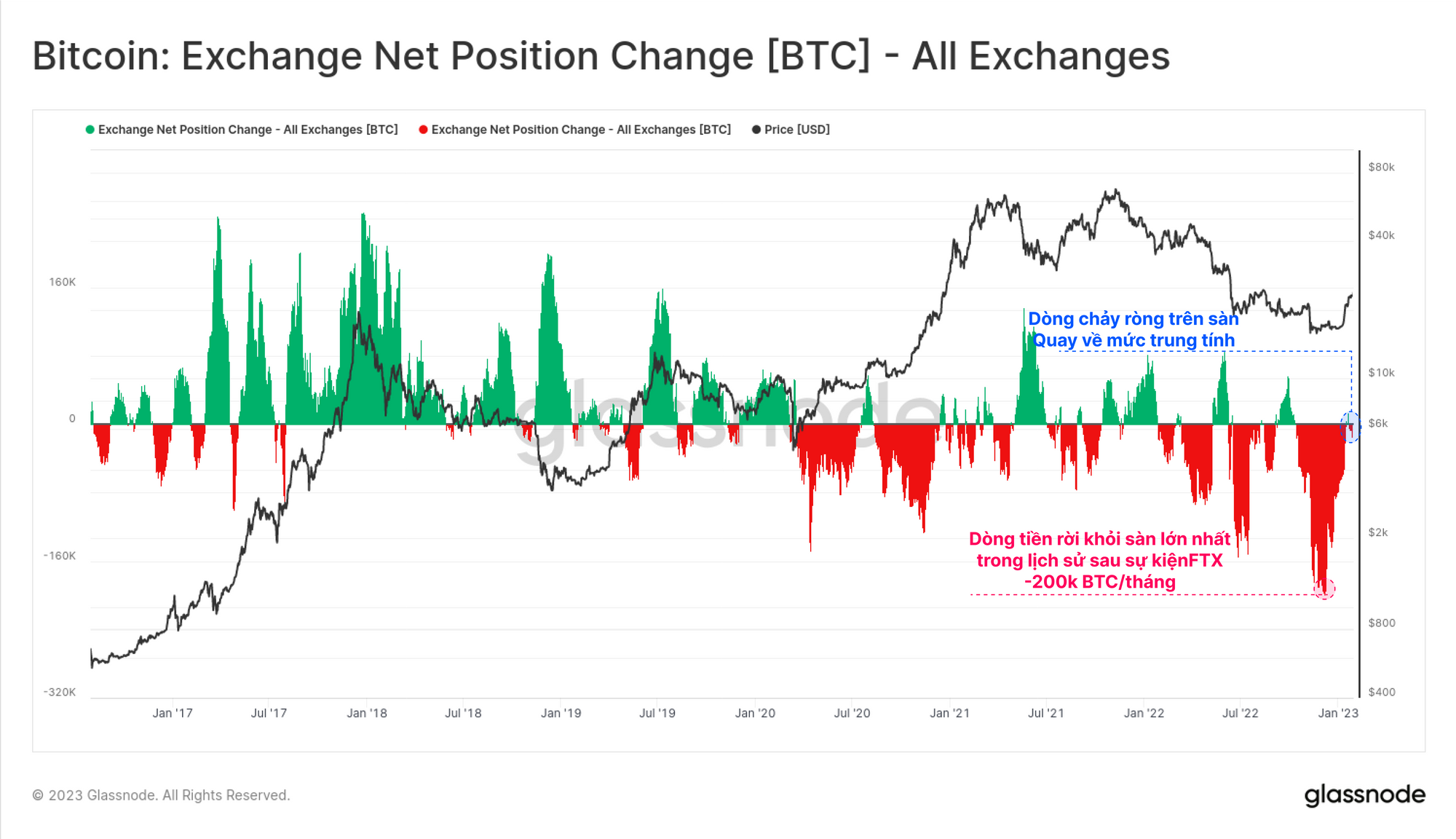 Giai đoạn cuối tháng 1, Bitcoin đã đạt mức tăng trưởng hàng tháng mạnh nhất kể từ tháng 10 năm 2021, được thúc đẩy bởi cả nhu cầu giao ngay và một loạt các đợt thanh lý lệnh short. Đợt tăng giá này khiến một phần lớn thị trường quay trở lại trạng thái có lợi nhuận và dẫn đến các giao dịch hợp đồng tương lai ở mức bù hoãn mua lành mạnh. Chúng tôi cũng lưu ý rằng xung lực ban đầu của dòng tiền chảy ra khỏi các sàn giao dịch, sau sự kiện FTX, đã giảm xuống mức trung tính và hiện được cân bằng bởi dòng vốn tích cực .
