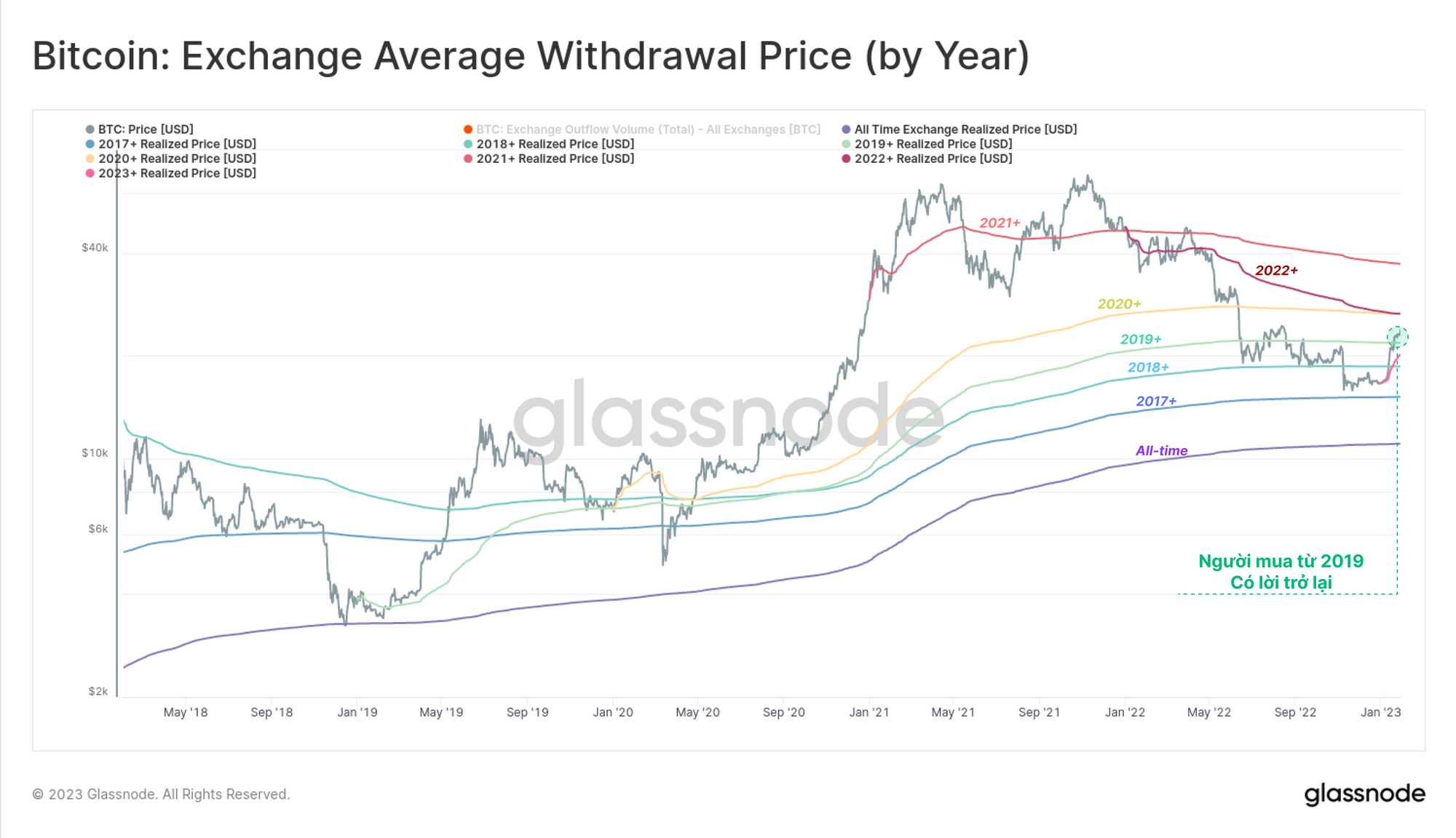 Trong thị trường giảm giá 2022, chỉ những nhà đầu tư từ năm 2017 trở về trước mới không bị lỗ trên danh nghĩa, các nhà đầu tư từ 2018 chứng kiến cơ sở chi phí của họ bị nhấn chìm bởi các cây nến đỏ gây ra do sự kiện FTX. Tuy nhiên, đợt tăng giá hiện tại đã khiến nhóm nhà đầu tư từ năm 2019 trở về trước ($21,800) quay lại trạng thái lời trên danh nghĩa.