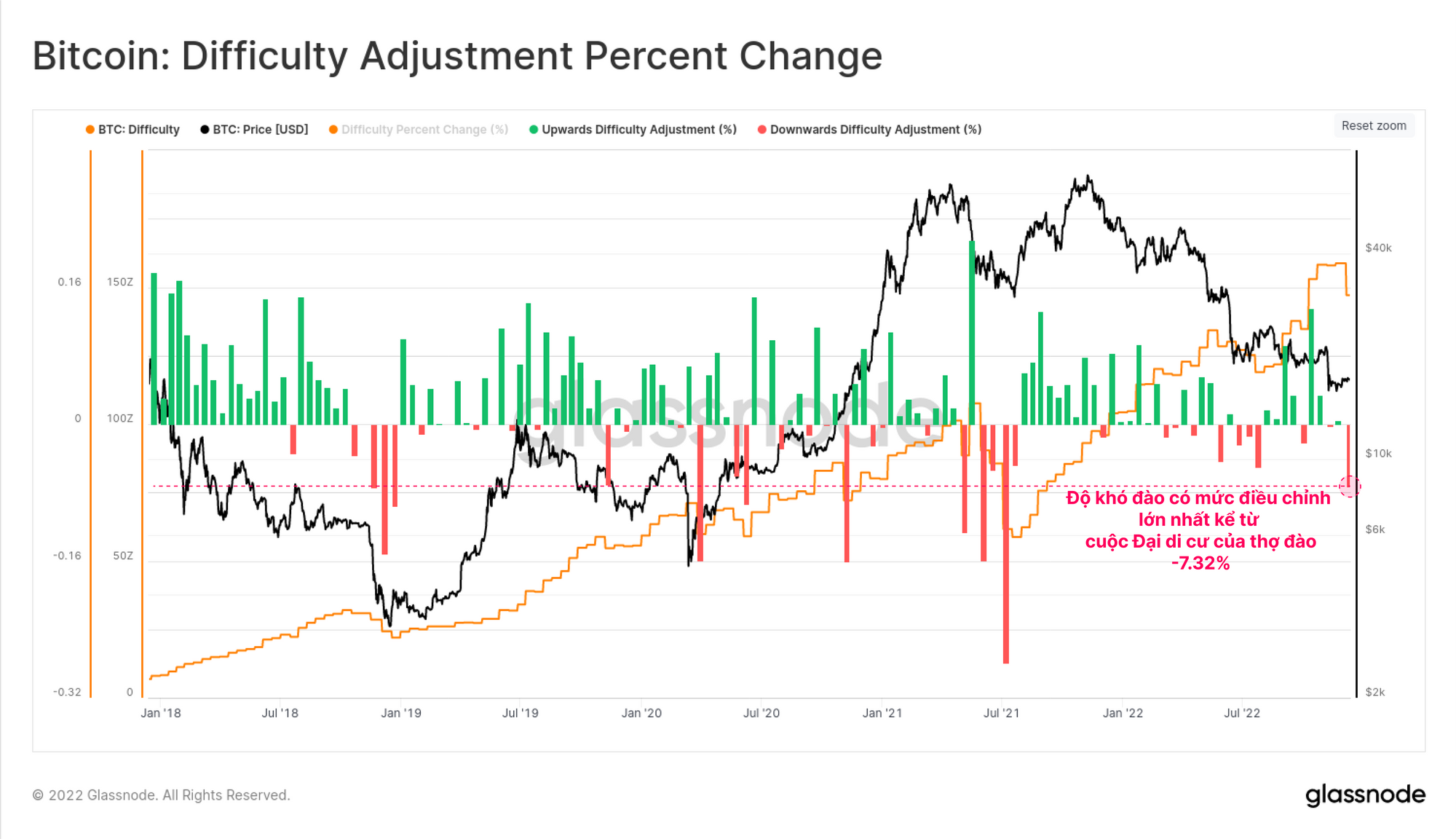 Tuần trước chúng ta đã chứng kiến sự điều chỉnh giảm độ khó đào lớn nhất kể từ Cuộc đại di cư của các thợ đào vào tháng 7 năm 2021. Độ khó đào giảm 7.32% cho thấy một lượng lớn máy đào đang hoạt động đã bị tắt, có thể là do áp lực tài chính.