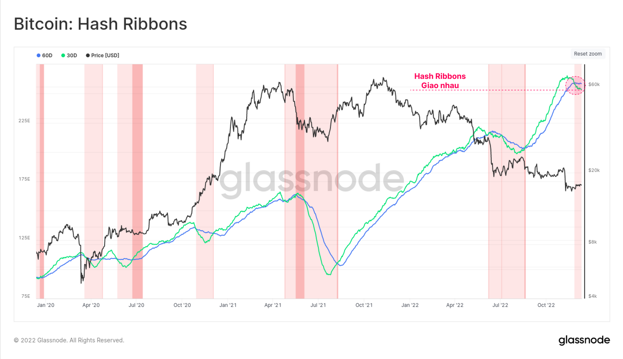 Kết quả là các hash-ribbon đã đảo ngược một lần nữa, với sự giao thoa xảy ra vào cuối tháng 11. Điều này cho thấy rằng áp lực trong ngành khai thác khiến một số miner phải tắt máy đào. Sự kiện này thường liên quan đến thu nhập của thợ đào thấp hơn chi phí hoạt động, khiến các xưởng đào không có lãi.
