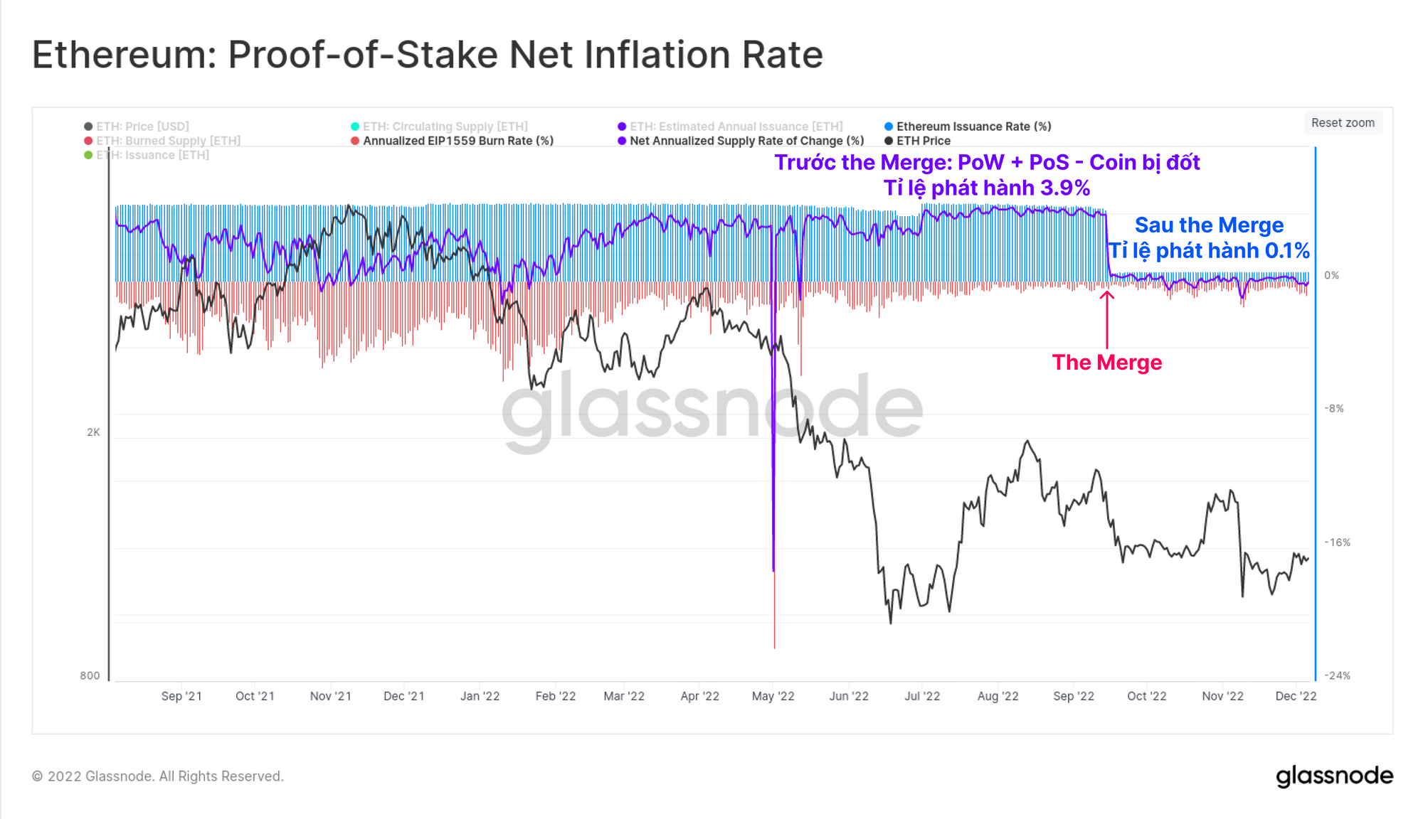 Cùng với việc chuyển đổi sang Proof-of-Stake, chính sách tiền tệ của Ethereum đã được điều chỉnh với lượng phát hành thêm thấp hơn đáng kể. Tỷ lệ phát hành danh nghĩa (màu xanh) là khoảng 0.5%, tuy nhiên sau áp dụng đề xuất EIP1559 (màu đỏ), tỷ lệ này gần như được bù đắp hoàn toàn và rơi vào khoảng 0.1%. So sánh với tỷ lệ lạm phát ròng là 3.9% trước khi Hợp nhất, cho thấy mức độ thay đổi đối với việc phát hành đã diễn ra mạnh mẽ như thế nào.