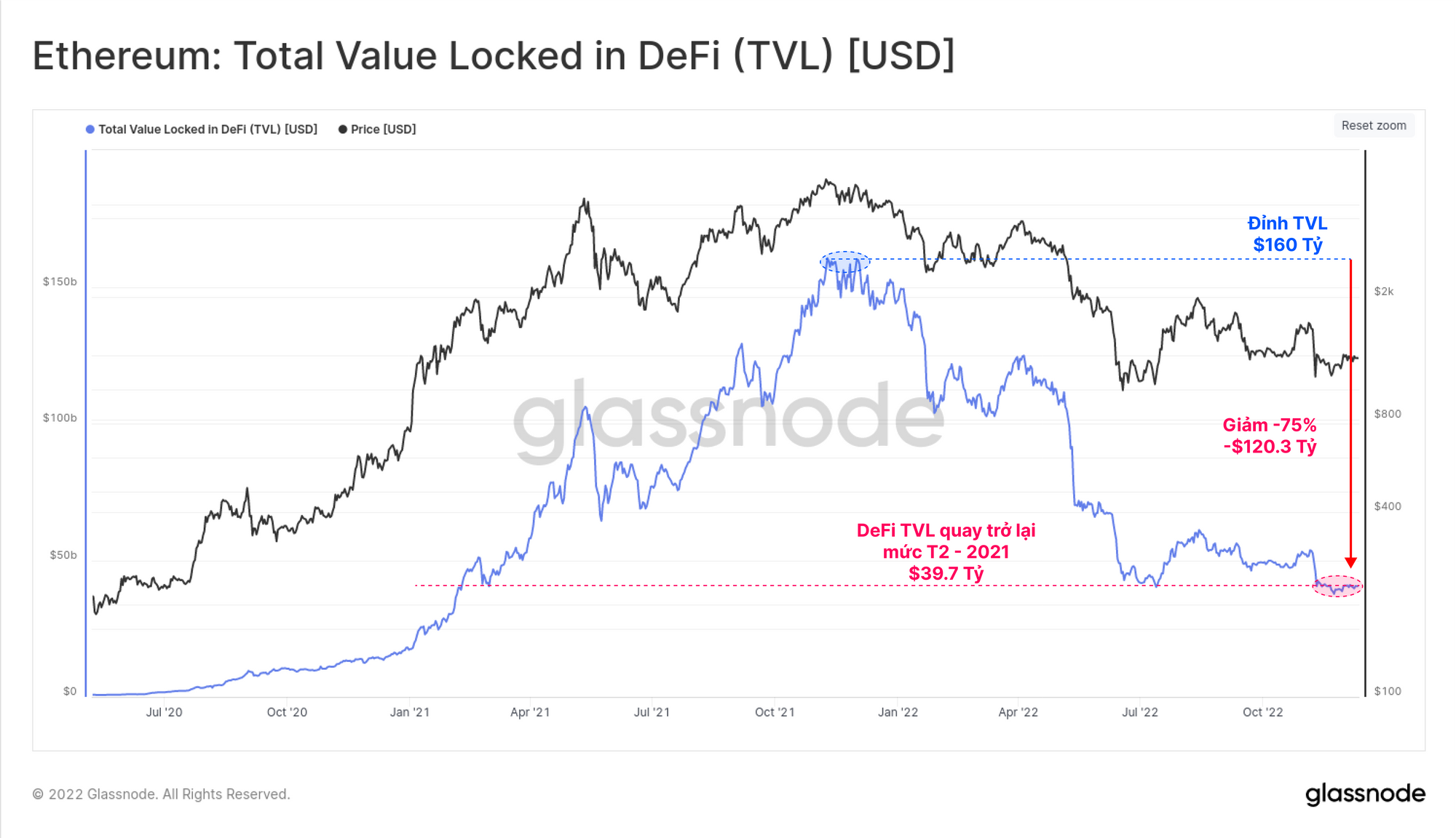 Với sự sụt giảm lớn về giá và tính thanh khoản bị thu hẹp nghiêm trọng, tổng giá trị bị khóa trong DeFi đã giảm đáng kể. Sau khi đạt mức cao nhất là 160 tỷ đô vào tháng 11 năm 2021, DeFi TVL đã giảm hơn 120.3 tỷ đô (-75%). Điều này làm giảm giá trị tài sản thế chấp DeFi xuống còn 39.7 tỷ đô, trở về mức của tháng 2 năm 2021.